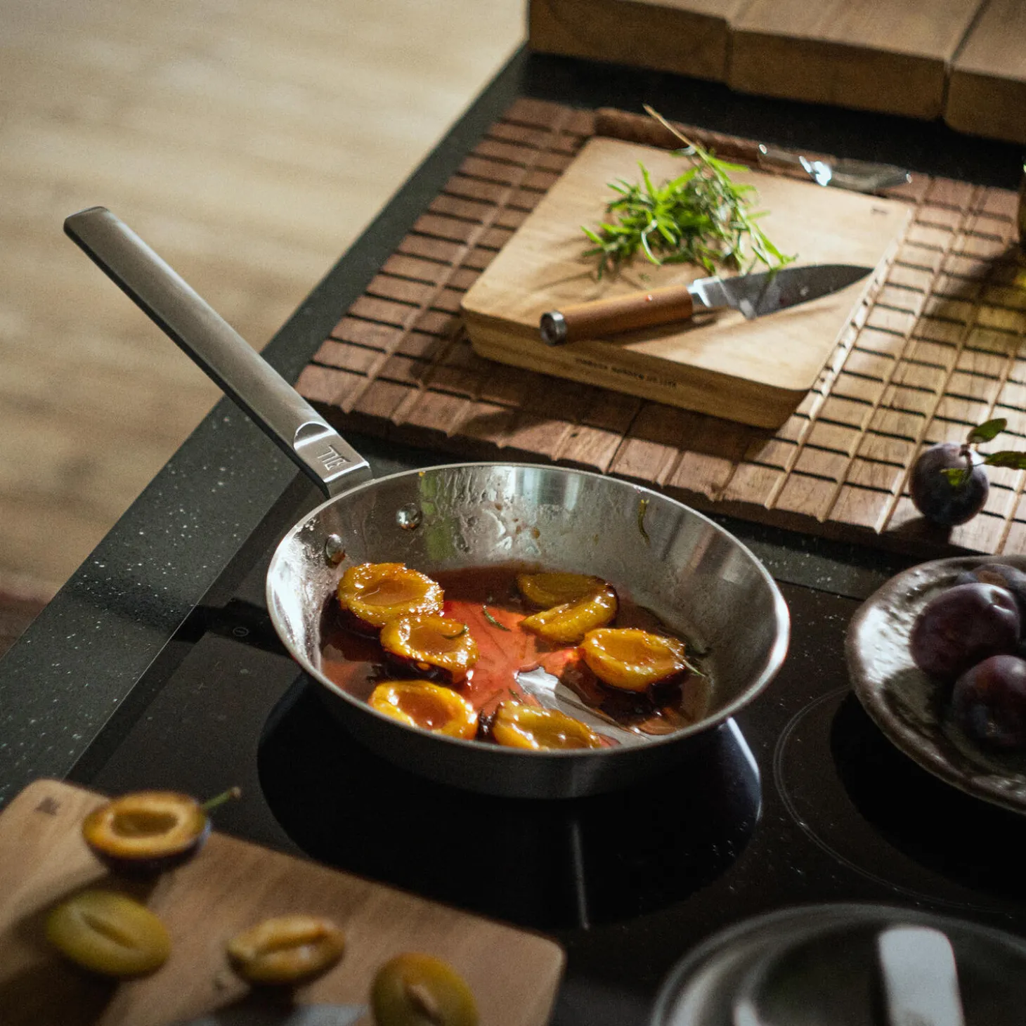 Fiskars Norden kogegrej i stål af højeste kvalitet udspringer af mange års håndværksmæssige traditioner med dybe rødder i den nordiske muld og er et godt eksempel på langtidsholdbart nordisk design, inspireret af naturen. Norden stegepande i stål uden belægning (24 cm) har en tyk bund og en 3-lagskonstruktion fra kant til kant, der sikrer en jævn varmefordeling og gør panden særdeles velegnet til tilberedning af mindre portioner samt til stegning ved høje temperaturer, når du ønsker en sprød stegeskorpe. Aluminiumskernen mellem de ydre og indre lag af rustfrit stål sikrer jævn og effektiv varmefordeling på alle kogezoner. Et indgraveret mønster i bunden af panden giver en mere jævn fordeling af madlavningsolie/smør. Det markante håndtag i rustfrit stål minimerer overførslen af varme. Maks. stege- og ovntemperatur helt op til 270°C. Fremstillet i Finland.