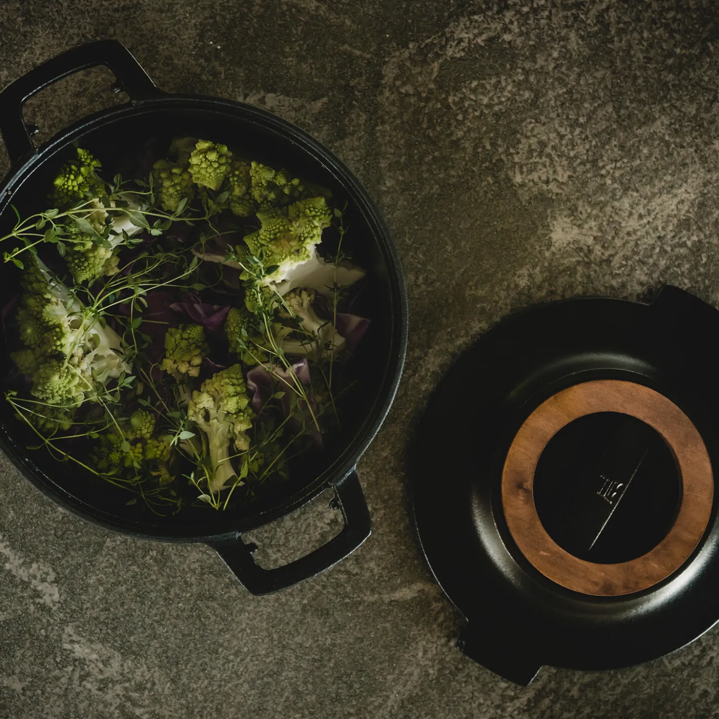 Fiskars Norden er en serie af køkkengrej i støbejern. Serien er en innovativ kombination af premium materialer, som tåler høje temperaturer, og har overlegne non-stick egenskaber. Støbejernsgryden er inspireret af den nordiske natur – og traditioner, og vil med sine unikke egenskaber hjælpe med at frembringe kraftige smage til dine retter. Støbejern holder længe på varmen, og er perfekt til simremad. Den unikke Thermium™ mineralbehandling på overfladen af støbejernet giver gryden overlegne non-stick egenskaber selv ved høje temperaturer. Mineralbehandlingen sikrer også, at støbejernet ikke ruster eller kræver pleje med olie. Aftagelig bordskåner på låget i finsk birketræ.
