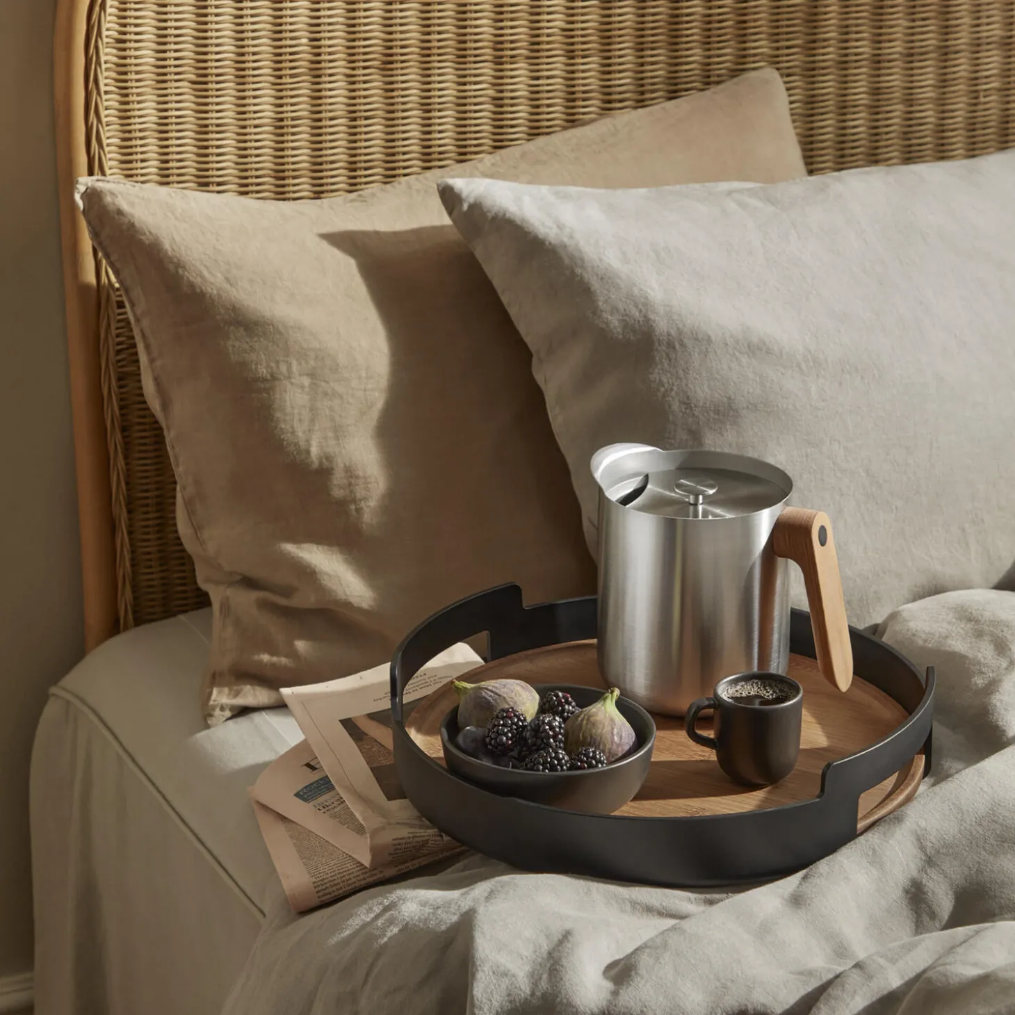 Den stilfulde og praktiske Serveringsbakke er ideel til at servere alt fra morgenmad på sengen til kaffe i stuen. Bakken er rummelig og har høje kanter, som sikrer, at indholdet bliver, hvor det skal, mens de solide bæregreb giver ekstra stabilitet, når du flytter på den. Det FSC-certificeret bambus giver et naturligt udtryk, mens den matsorte finish tilføjer et strejf af moderne elegance. Det smukke design gør, at bakken også kan bruges som en dekorativ del af din indretning, perfekt til at arrangere nips, lysestager og blomster.