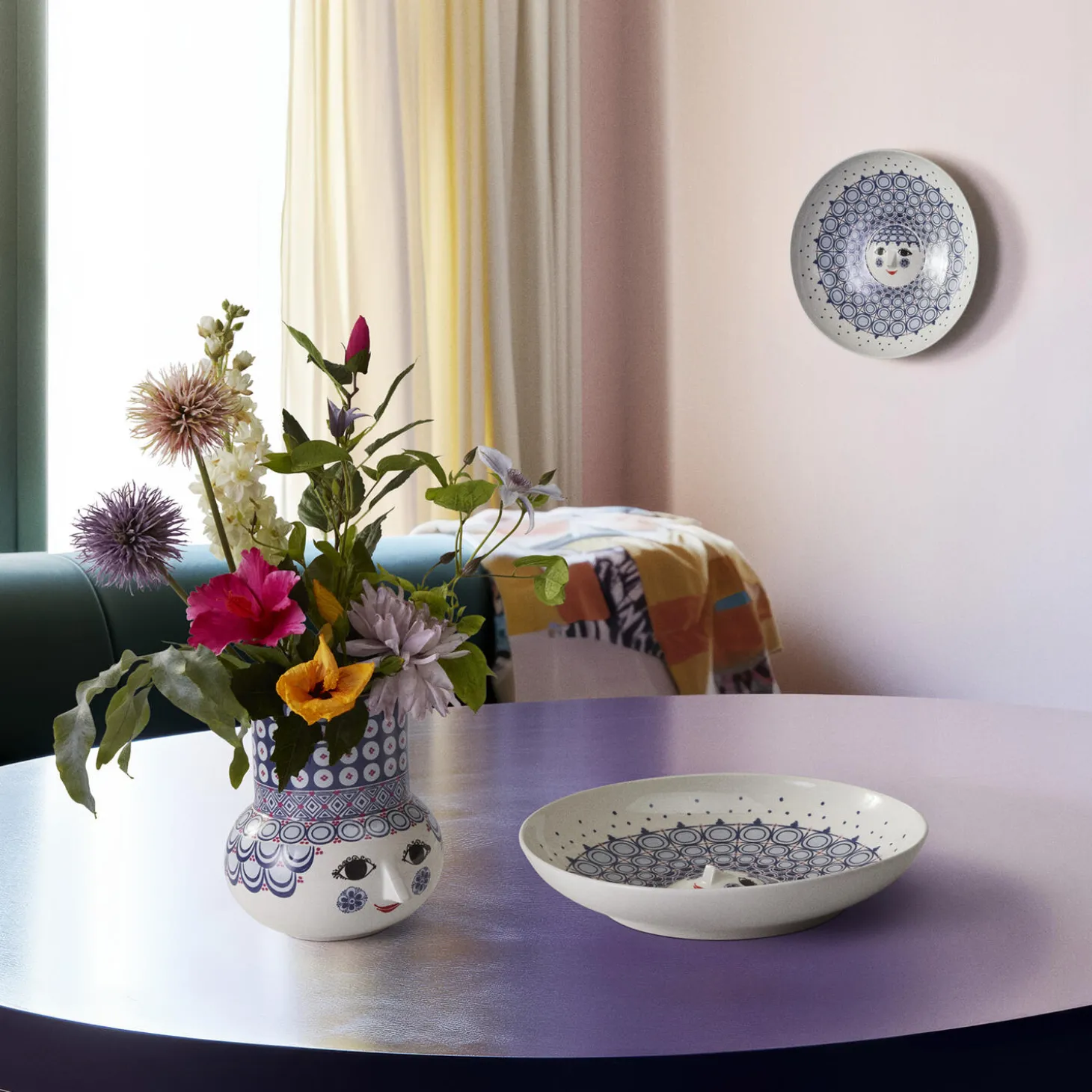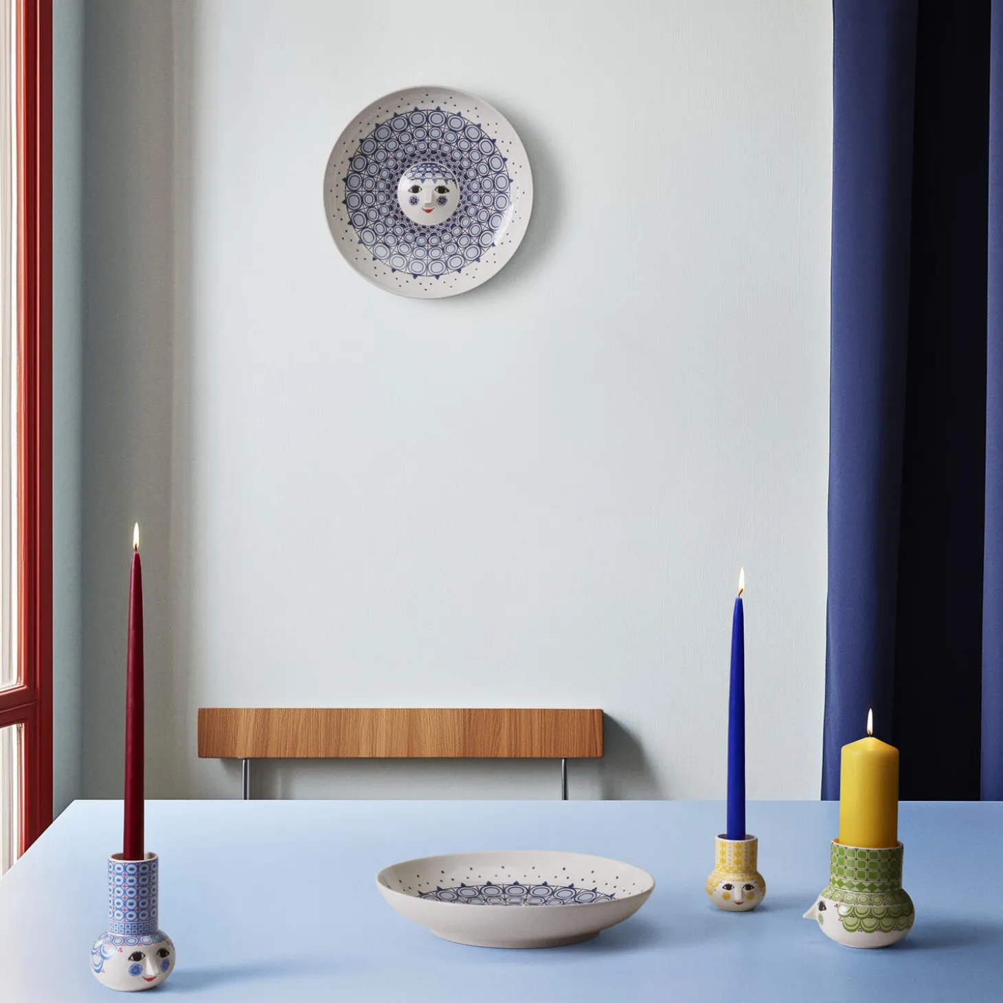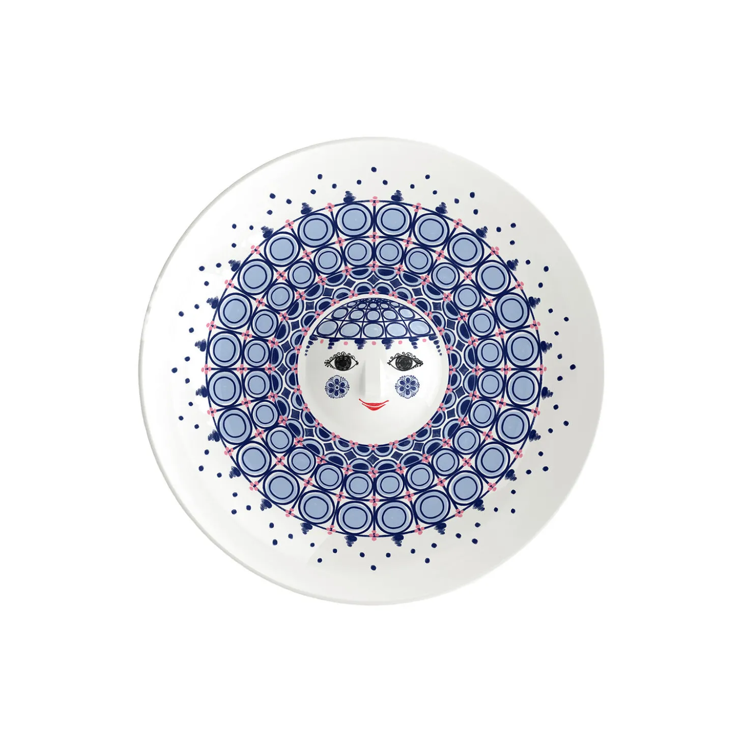 Udfold din farverige personlighed og skab plads til glæde med Bjørn Wiinblads Olga. Med sit søde smil, kulørte kinder og karakterfulde dekorationer rummer Olga på alle måder essensen af Bjørn Wiinblad som person og kunstner – også når hun tager form som et stort og dekorativt bordfad. Glad og drømmende skaber hun liv og personlighed i indretningen med sit poetiske udtryk og sine sprudlende farver. Og med det smukke og smilende Olga-bordfad fra Bjørn Wiinblad i overvejende mørkeblå nuancer med lyseblå toner og lyserøde prikker skaber du finurlighed i fuldt flor overalt i hjemmet. Bordfadet måler 33 cm i diameter og 6 cm i højden og er perfekt som et flot og figurativt fad til frisk frugt eller som et betagende som et unikt statement piece vil emme af personlighed og kreativ udfoldelse. Men hvem siger, at et bordfad overhovedet behøver at stå på bordet? For helt i tråd med Bjørn Wiinblads kunstneriske ånd er der næsten igen grænser for, hvor du kan placere Olga-fadet. Brug de to huller på bagsiden og hæng det op på væggen som en betagende dekoration, der vil emme af personlighed og kreativ udfoldelse. Uanset hvor du finder plads, så kan du i fulde drag nyde det søde, runde ansigt med de mandelformede øjne og den ikoniske trekantede næse, der nok nærmest er selve personificeringen af Bjørn Wiinblads kunst. Olga-bordfadet er lavet af skinnende glaseret keramik med farverige decals, og dekorationerne er en skøn blanding af originale Bjørn Wiinblad-mønstre, der i en skøn blå farvepalet giver dig et moderne og friskt udtryk. Bjørn Wiinblad var en livsglad kunstner med en stor og farverig personlighed, der gik sine egne veje og ikke var bange for at drømme og tænke stort. Den sjæl mærkes også til fulde i Olga, der hviler i sig selv og inviterer os til at udtrykke vores egen stil og personlighed i indretningen med udtryksfulde dekorationer skabt med inspiration i Bjørn Wiinblads originale kunstværker. En ting er sikkert: Det bliver ikke kedeligt, når Olga flytter ind.