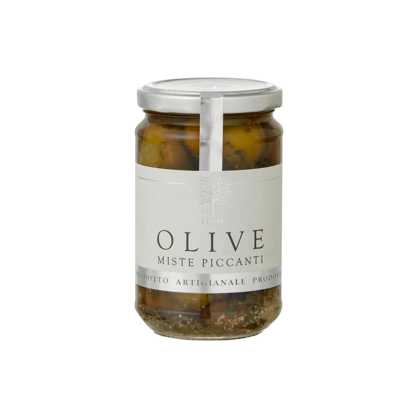 Blandede spiseklar oliven med sten. I en lage af ekstra jomfruolivenolie, krydderurter, chili og laurbær.