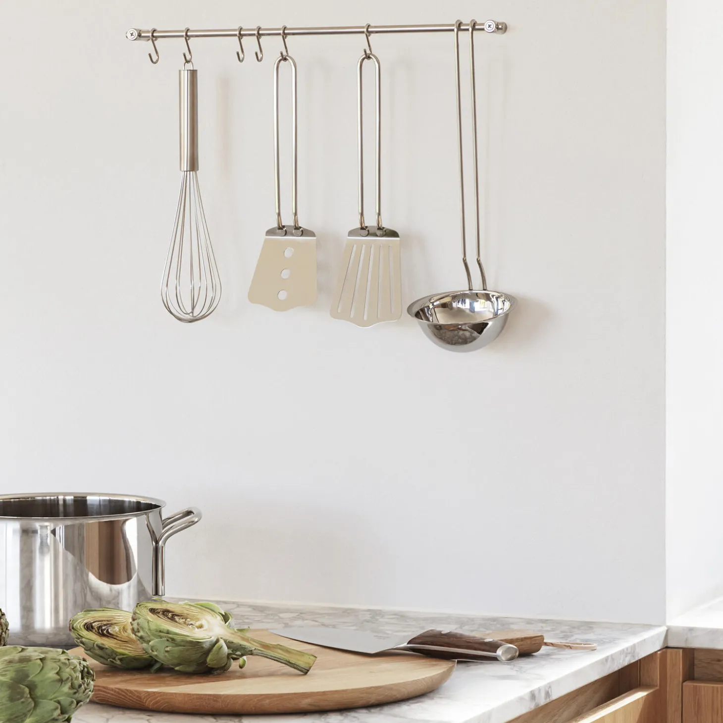 Den praktiske køkkenstang i rustfrit stål skaber ekstra væghængte opbevaringsmuligheder. Spar derfor skabsplads ved at hænge køkkenredskaber og pander i køkkenet eller tilmed håndklæder på badeværelset. Køkkenstangen kan nemlig også fungere som knagerække, tøjstativ eller bøjlestang i entréen og i soveværelset. Der medfølger seks S-kroge. S-kroge kan købes separat.