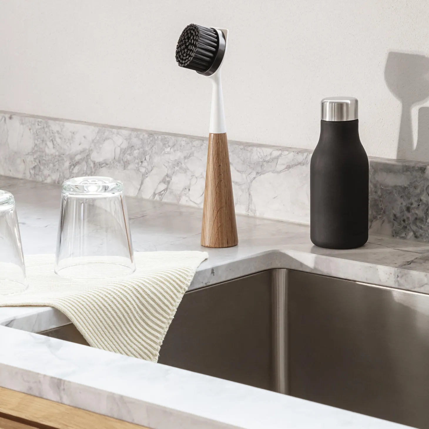 Let opvasken med den funktionelle og stilrene opvaskebørste. Børstehovedet har en praktisk kant, der effektivt skraber genstridigt snavs væk. Takket være et lod i den flade bund, kan børsten stå af sig selv, og den behøver hverken holder eller skjuler. Den er nem at rengøre og vedligeholde. Børstehovedet kan udskiftes.
