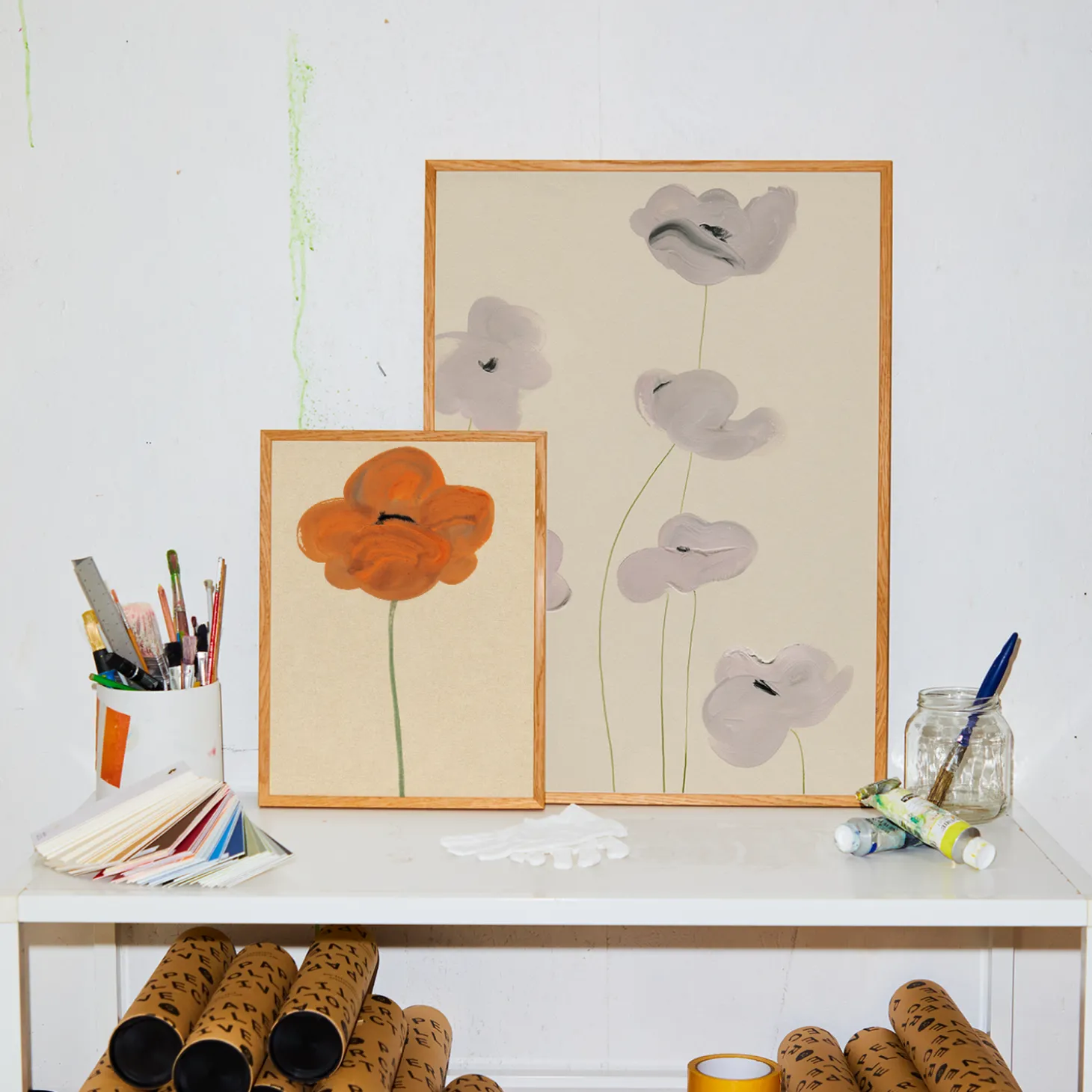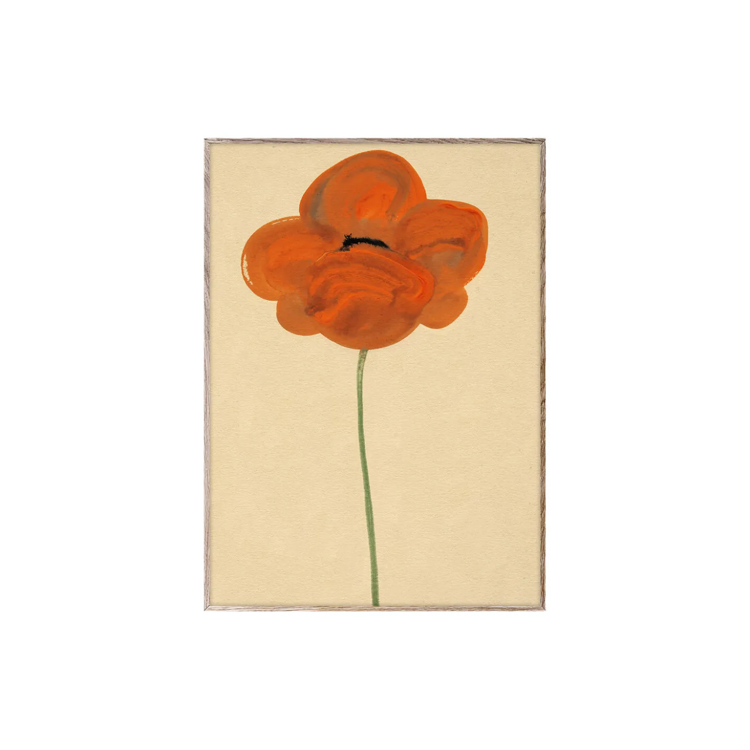 Swedish fashion illustrator Amelie Hegardt has transported her flowing forms and layered details from figures to florals. Orange Vallmo features a single blooming poppy standing tall on a thin stem. The depth of the flowering centerpiece has been created by thick, layered paint – sitting against a warm backdrop to create a vibrant and striking composition. Amelie Hegardt for Paper Collective. An art print/poster manufactured in Denmark from environmentally certified materials and production.