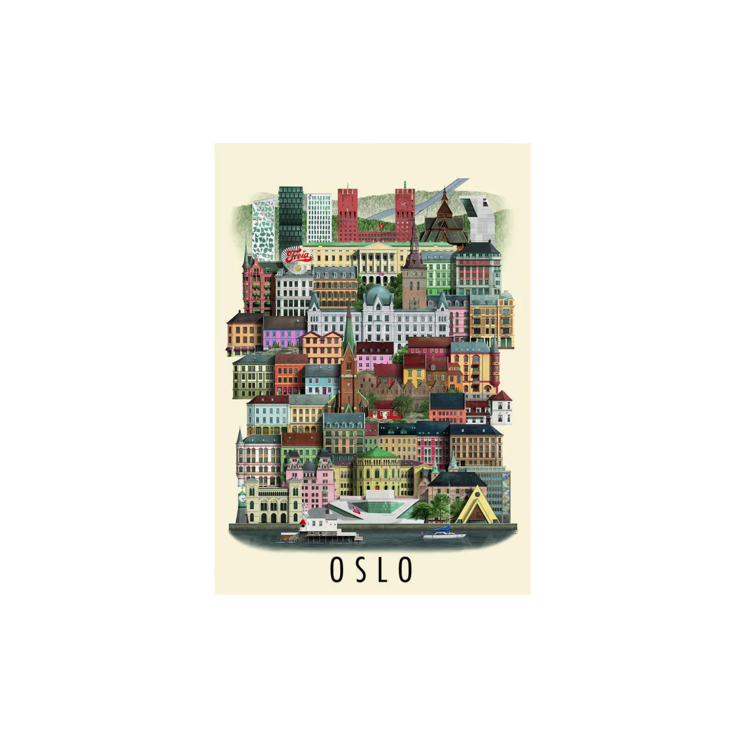 Selv om Oslo er den mindste af de tre skandinaviske hovedstæder, kan byen alligevel bryste sig af en lang række forskellige kvarterer. I én gade fremstår byen således meget storbypræget med høje og moderne bygninger, mens den i andre gader ligner en lille lokal landsby med lutter gamle træhuse. I de senere år har Oslo imponeret med et arkitekturlandskab ud over det sædvanlige langs den gamle havnefront, hvor det nye operahus med tagkonstruktionen af hvidt marmor og The Bar Code, som består af 12 højhuse i forskellige højder og bredder, er blandt de mest berømte bygninger. Denne plakat giver dig essensen af Oslo med et bredt udvalg af bygninger fra alle kvarterer af byen. Gå på opdagelse blandt de mange farverige bygninger lige fra det gamle arbejderklassekvarter Grünerløkka (Grüners anlæg el. område) til de fashionable facader i Frogner – og naturligvis de mange andre vartegn i vidunderlige Oslo.