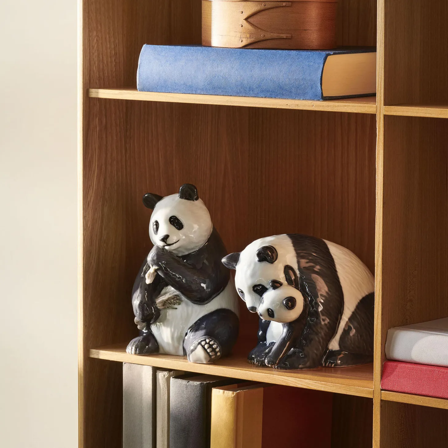 Panda-figuren blev en del af Royal Copenhagens sortiment for første gang i 1994 og nu har den smukke bjørn fundet vej tilbage til vores permanente kollektion. De to panda-figurer afbilder den elskelige bjørn, der nyder et bambus-måltid, og en panda-mor der krammer sin unge.