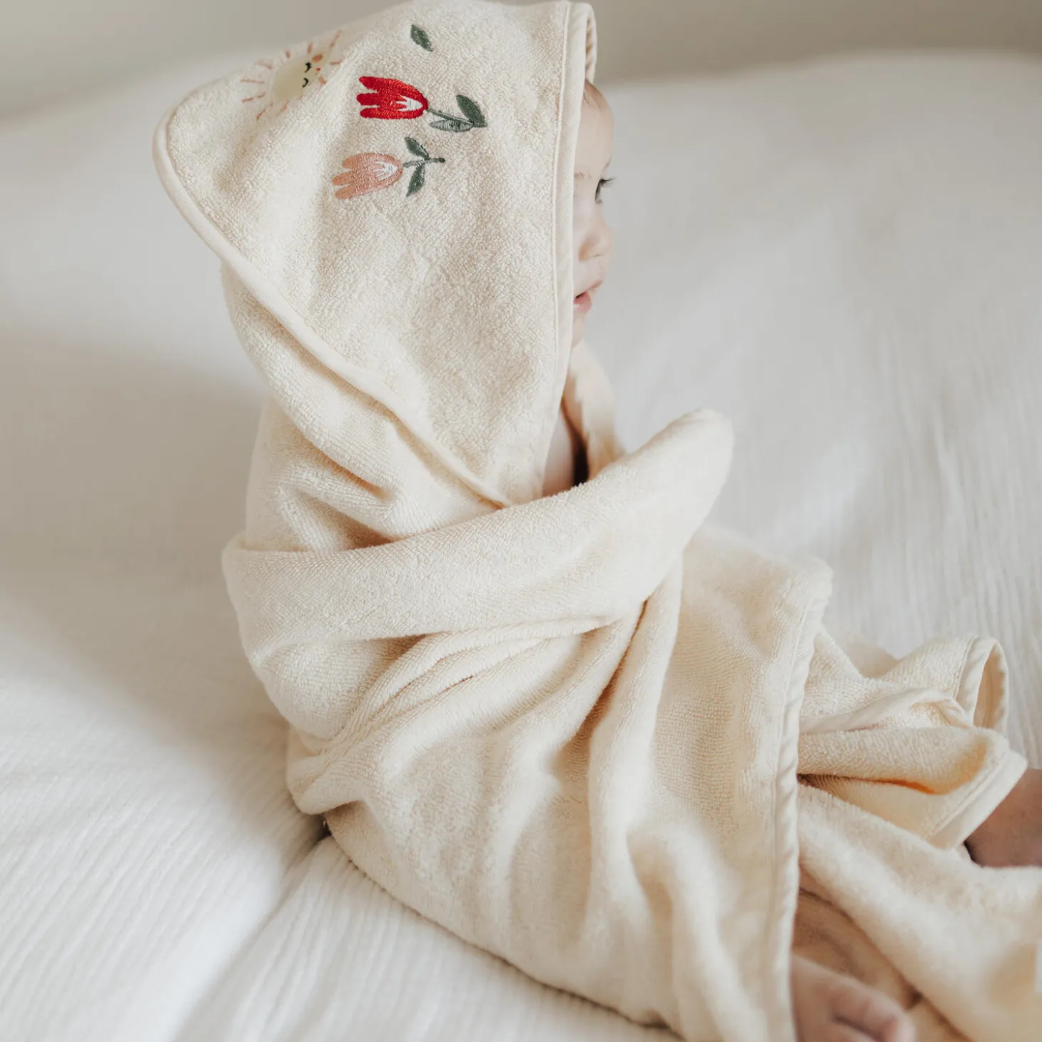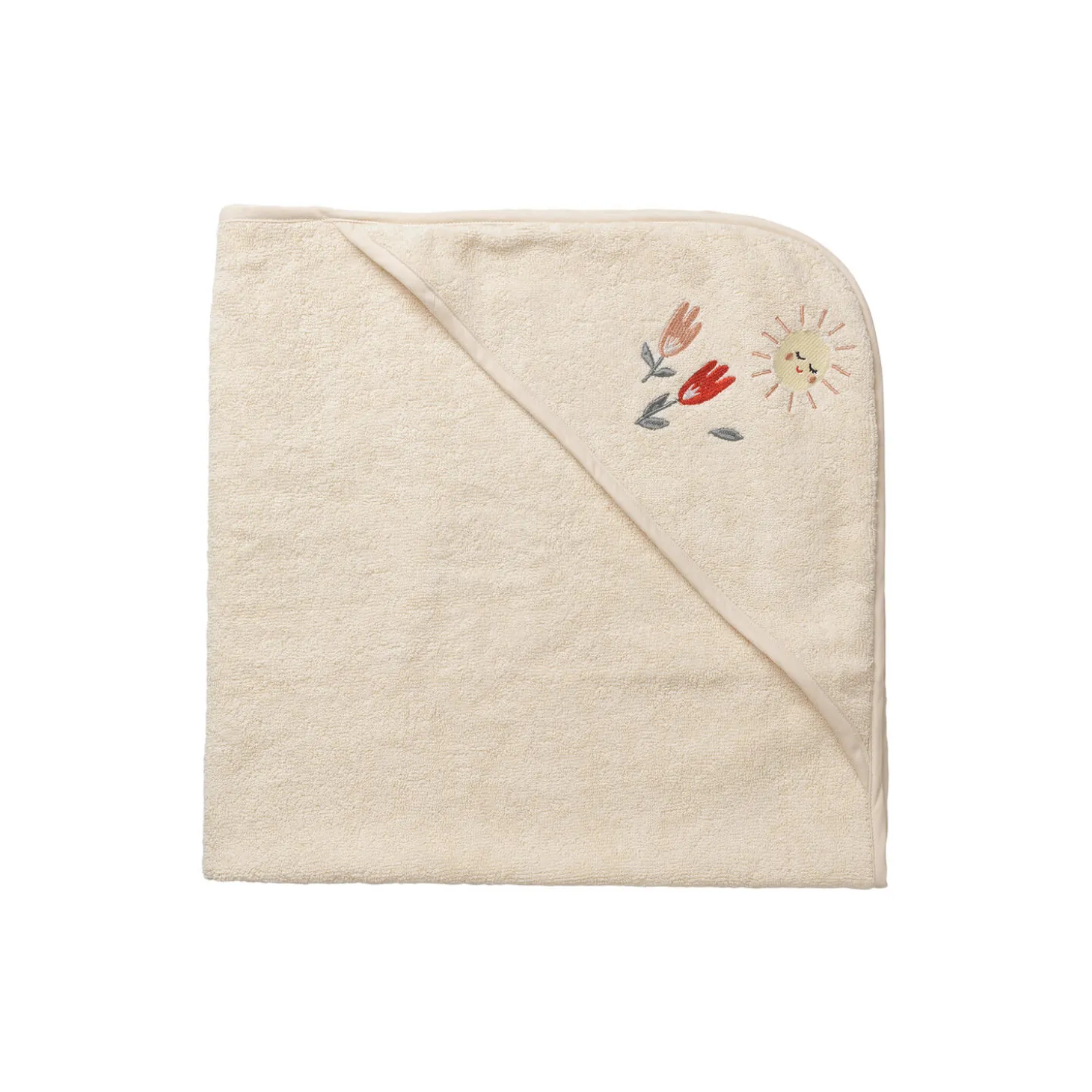 Lækkert vamset babyhåndklæde til de mindste i eksklusiv, tyk og blød frottékvalitet. I det ene hjørne har babyhåndklædet en hætte med et fint broderi inspireret af natur og udeliv.