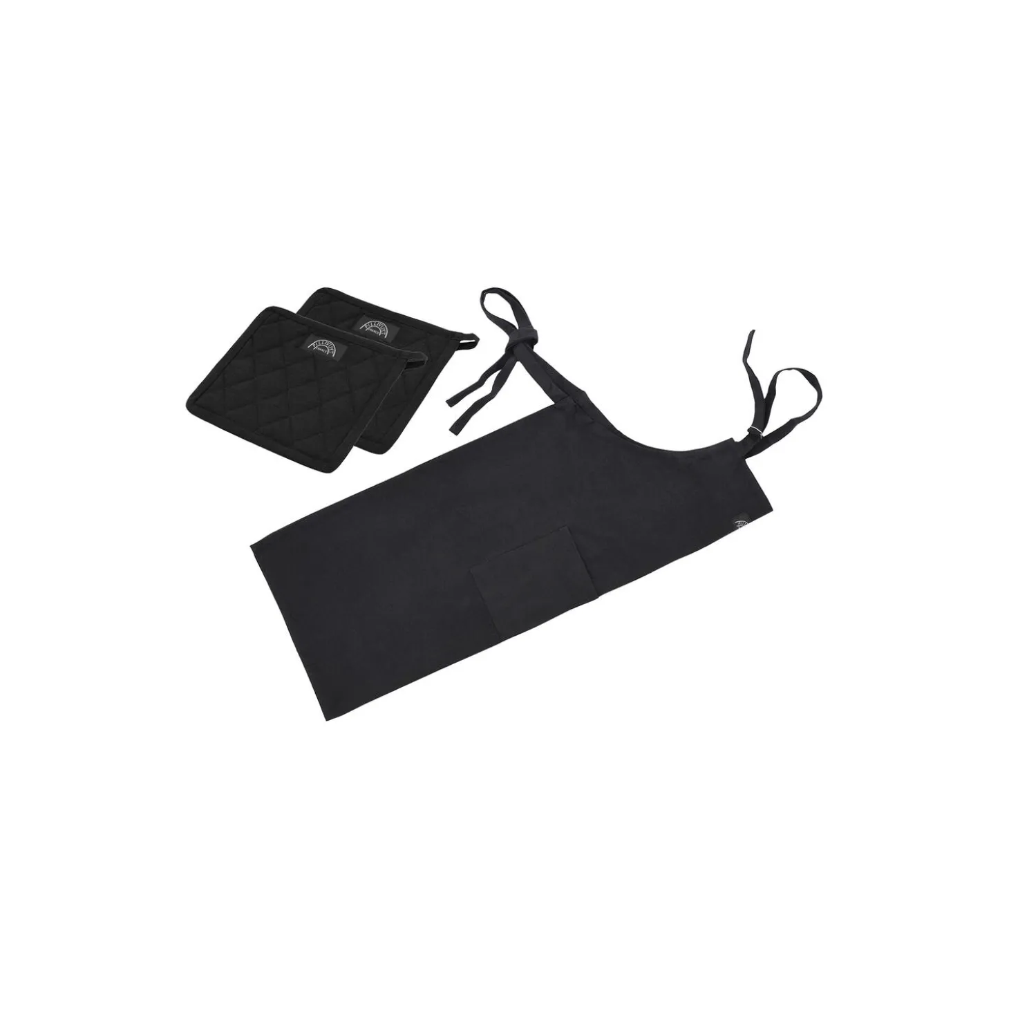 Tekstilsættet består af forklæde 95 x 80 cm og 2 grydelapper 22,5 x 22,5 cm i bomuld/polyester.Tekstilerne er fremstillet af genanvendte stofrester, der ellers ville være blevet kasseret. Stofresterne sorteres efter farve, trevles til tekstilfibre og bliver derefter spundet og vævet igen. Derfor kan der være nuanceforskelle fra parti til parti.