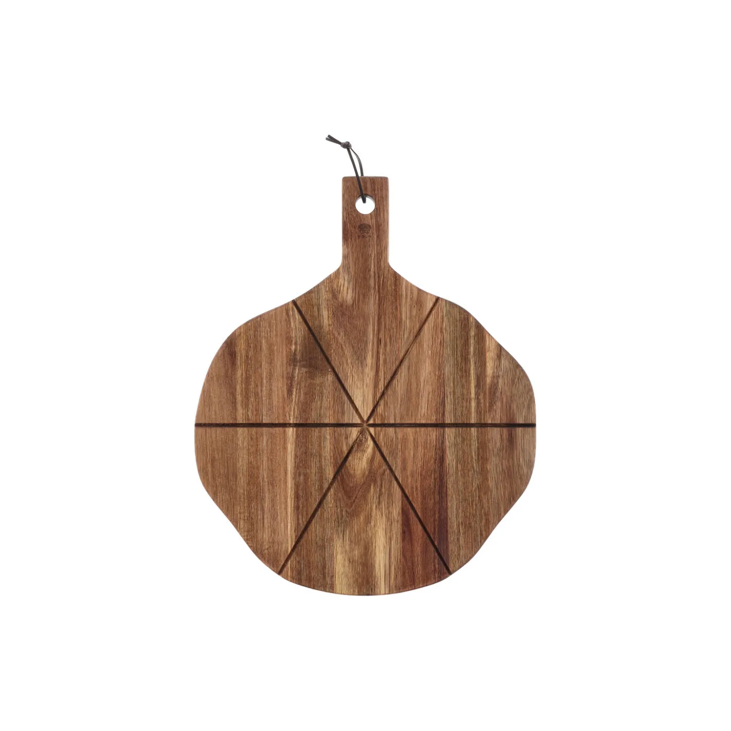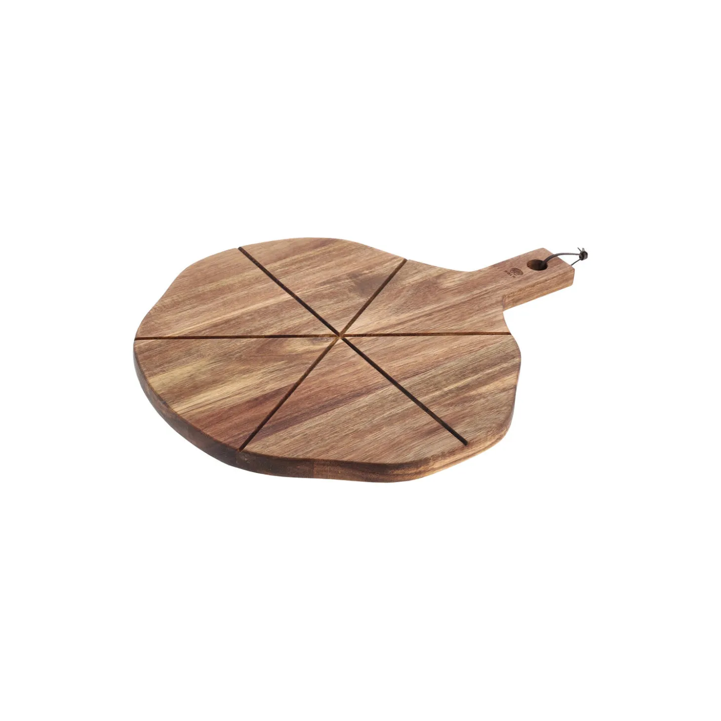 Pizzabræt i akacietræ med et solidt håndtag. Server en sprød pizza på et flot og rustikt serveringsbræt med riller, der gør det let at skære ud i lige store stykker. På den anden side er pladen glat og kan bruges til at servere fx ost og tapas på. 44 x 36 x 1,9 cm.Varen er produceret i FSC®-certificeret akacietræ (FSC-C166612).
