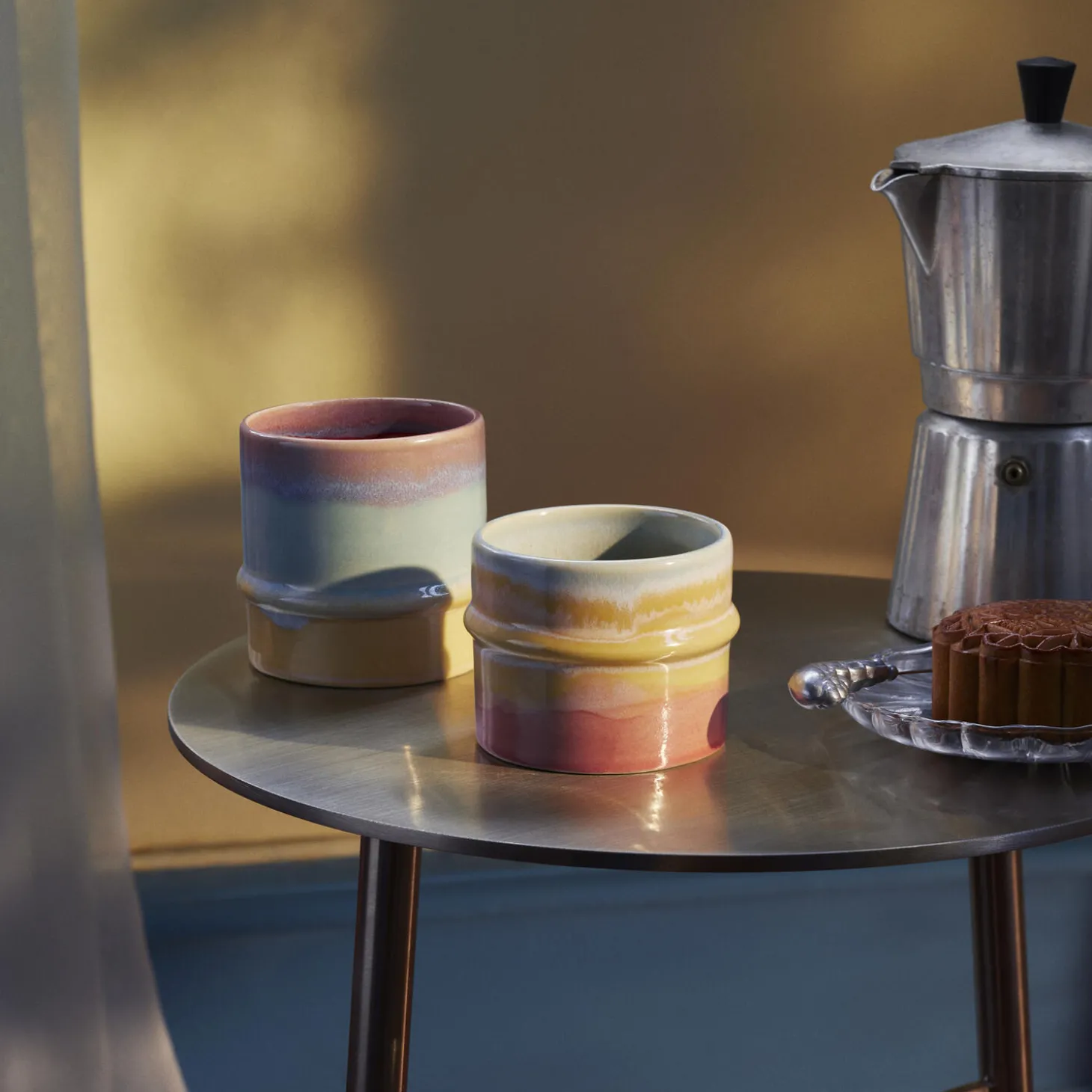Farverig popkultur møder håndlavede designtraditioner i samarbejdet mellem Kähler og designduoen KIMPOP, der tæller tv-personlighederne Sofie Linde og Joakim Ingversen. I en årrække har duoen med stor passion udforsket keramikkens verden, og deres viden om glasurer, brænding og det keramiske håndværk forener de med deres kærlighed til pop og populærkultur med udgangspunkt i de sene 80’ere og tidligere 90’ere, som de selv er rundet af. Og resultatet? Kollektionen Pottery, der er lige så farverigt som Sofie og Joakim. KIMPOP ønsker at udfordre danskernes brug af farver i boligen, bryde med de traditionelle skandinaviske farvetraditioner og invitere os til at tage flere farverige chancer i indretningen. Den nye kollektion fra Kähler X KIMPOP er et selvsikkert mix af pasteller, opulente glasurer, humoristiske detaljer og former, der vil frem i verden. Kollektionens krus rummer 27 cl og er perfekt til en god og stærk kop kaffe. Med fokus på både det visuelle udtryk og funktionaliteten er det designet ud fra et autentisk Kähler-design hentet fra arkiverne med en smuk, fremtrædende ring hele vejen rundt om kruset, der giver hånden et naturligt sted at gribe og hvile. Designet indbyder til at sidde med kruset og sanse – både designet, det du drikker og verden omkring dig.