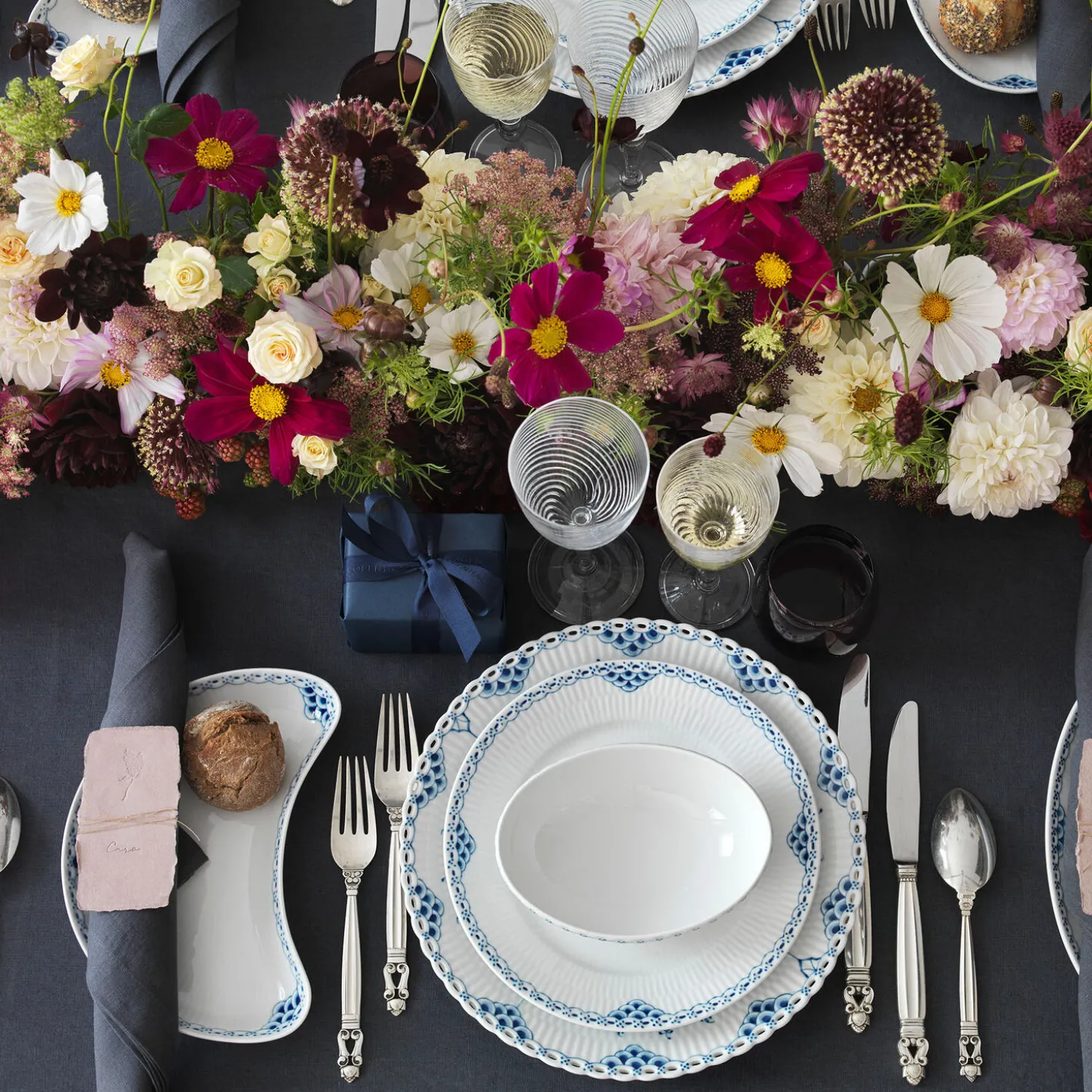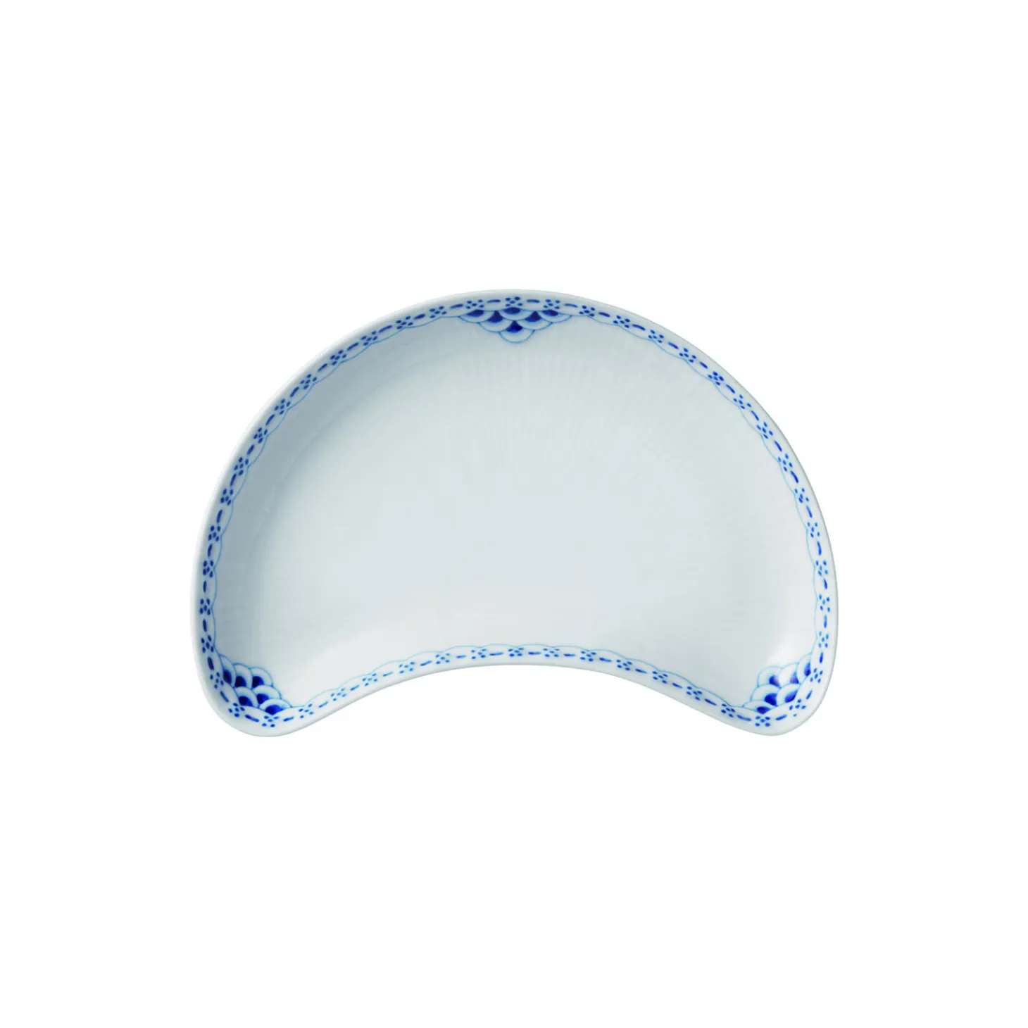Prinsesse halvmåneformet asiet i porcelæn fra Royal Copenhagen. Denne usædvanlige Asiet på 22,5 cm fra Prinsesse-stellet er en smuk tilføjelse til enhver Royal Copenhagen samling. Fadet tilfører et nutidigt udtryk til ethvert bord, og er også smukt som et lille pyntefad i hjemmet. Fadets halvmåneform prydes af en håndmalet blondekant, der skaber et feminint udtryk på den organiske form. Den lille asiet er nyttig som en sidetallerken til brød og andet tilbehør eller et fad til småkager og snacks.