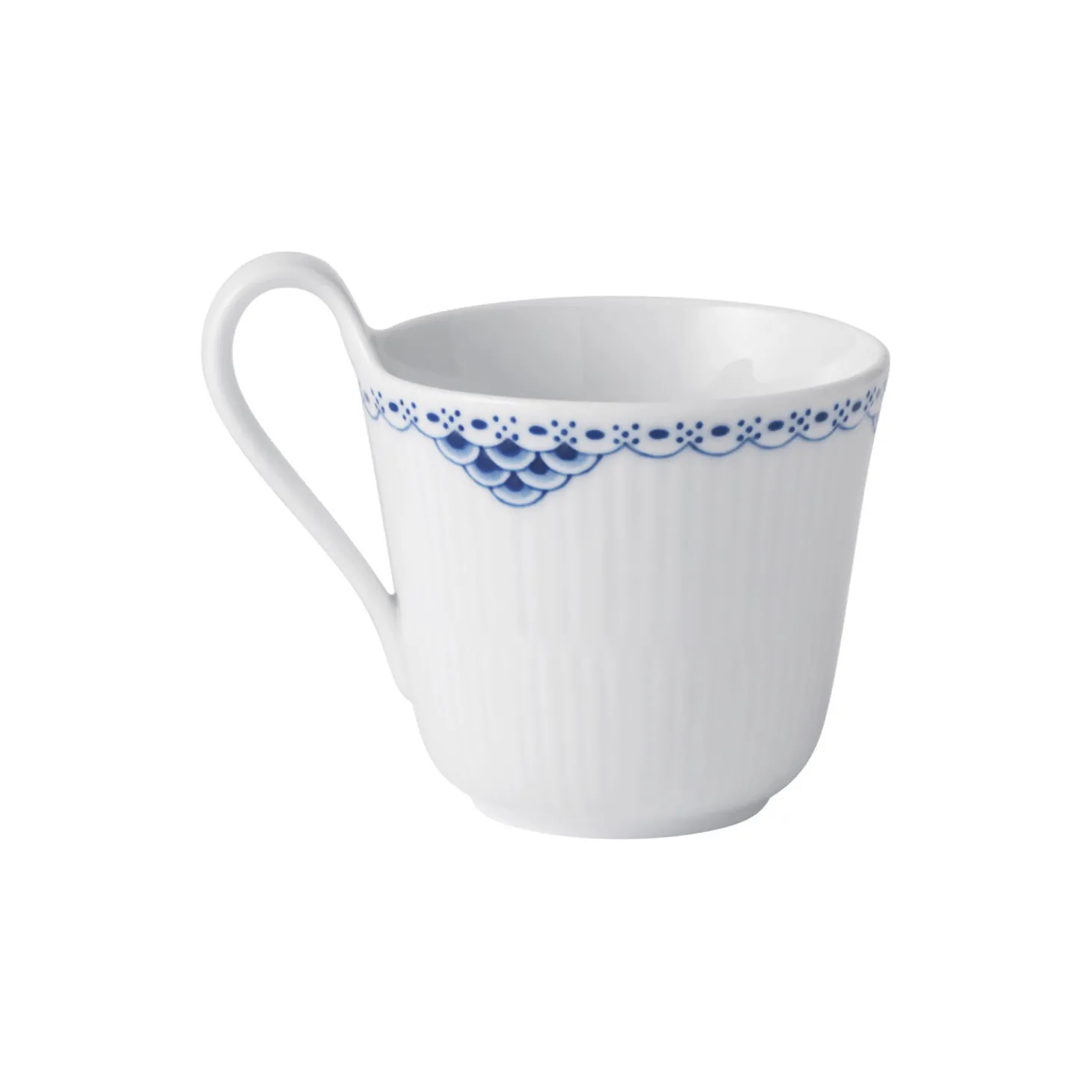 Prinsesse højhankskop i porcelæn fra Royal Copenhagen. Den smukke Prinsesse Højhankskop på 33 cl er en elegant tilføjelse til enhver samling af Royal Copenhagen, hvor den gør sig bemærket med sin feminine lethed. Den klassiske hank komplimenteres af det raffinerede, håndmalede mønster langs koppens kant, hvorfra der hænger blåmalede fiskeskælsdekorationer. Brug koppen som tekop eller kaffekop og fyld den med varme drikke.