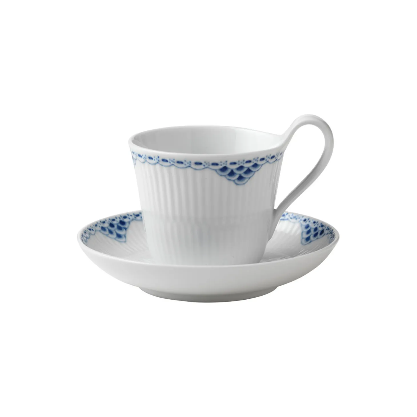 Prinsesse højhankskop med underkop i porcelæn fra Royal Copenhagen. Med den klassiske blonde fra Prinsesse-stellet har denne højhankskop med underkop på 24 cl et feminint udtryk, der danner en fin ramme om enhver hyggestund. Koppen og underkoppen prydes af en raffineret blondekant og fiskeskælsdekorationer, der er håndmalet på det riflede porcelæn.