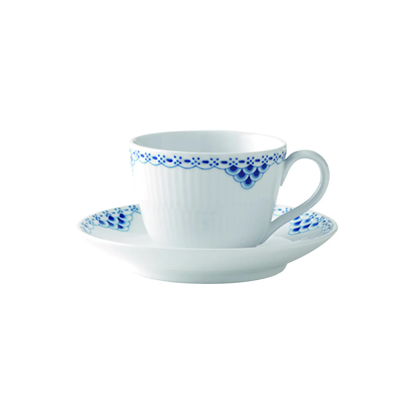 Prinsesse kop med underkop i porcelæn fra Royal Copenhagen. Denne Kop med underkop på 20 cl er håndmalet med det elegante mønster fra Prinsesse, der giver koppens klassiske form et raffineret udtryk. Dæk op til kaffe og kombinér gerne koppen med andre Royal Copenhagen-stel for et personligt udtryk.
