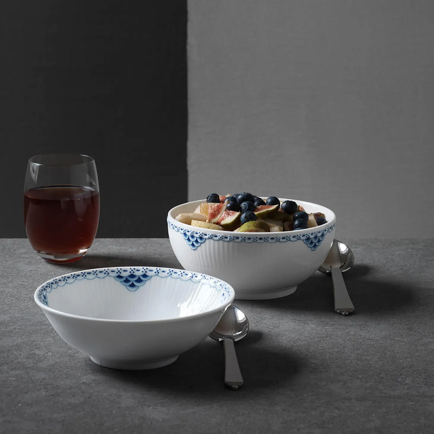 Prinsesse skål i porcelæn fra Royal Copenhagen. Denne lille Prinsesse Skål rummer op til 35 cl, hvilket gør den ideel som morgenmadsskål eller serveringsskål til små sideretter. På indersiden er skålen udsmykket med håndlavede, taktile rifler og en håndmalet, feminin blondekant, der understreger skålens klassiske udtryk.