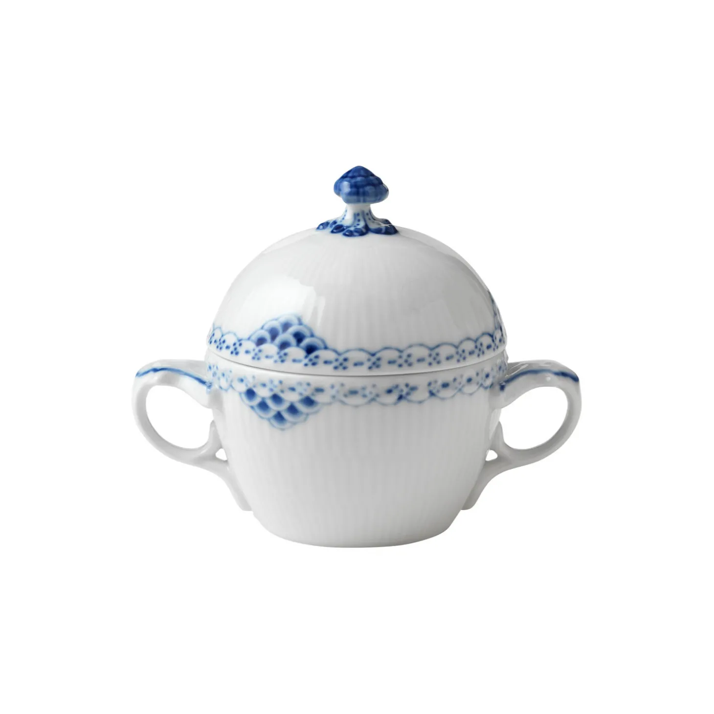 Prinsesse sukkerskål med låg i porcelæn fra Royal Copenhagen. Denne Prinsesse Sukkerskål med låg på 20 cl er håndmalet med stellets raffinerede blonde, der pryder skålens kant og låg. De enkle hanke skaber en smuk symmetri til skålens form, som er dekoreret med et sneglehus på toppen. Skålen kan også bruges som en lille slikskål eller til små serveringer.