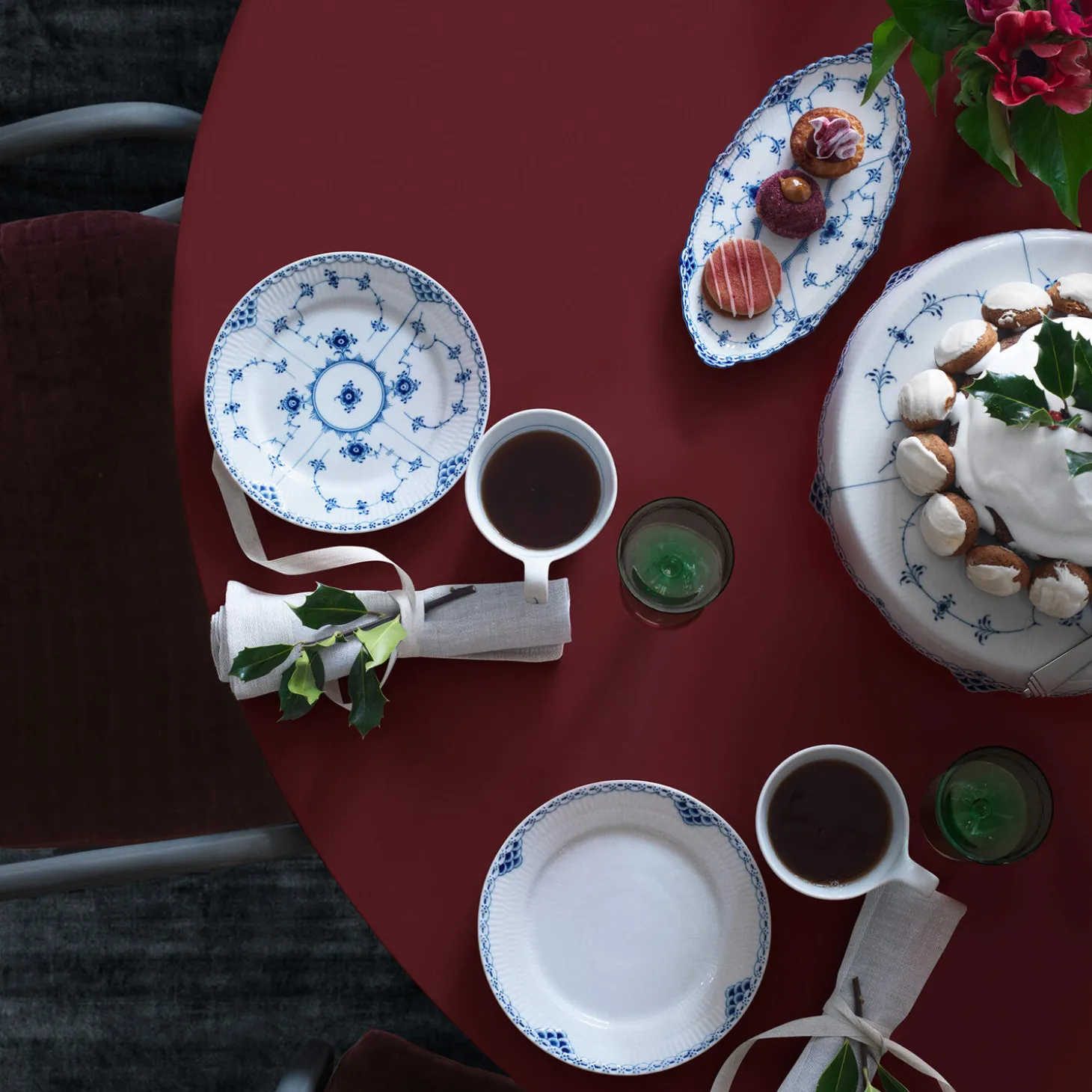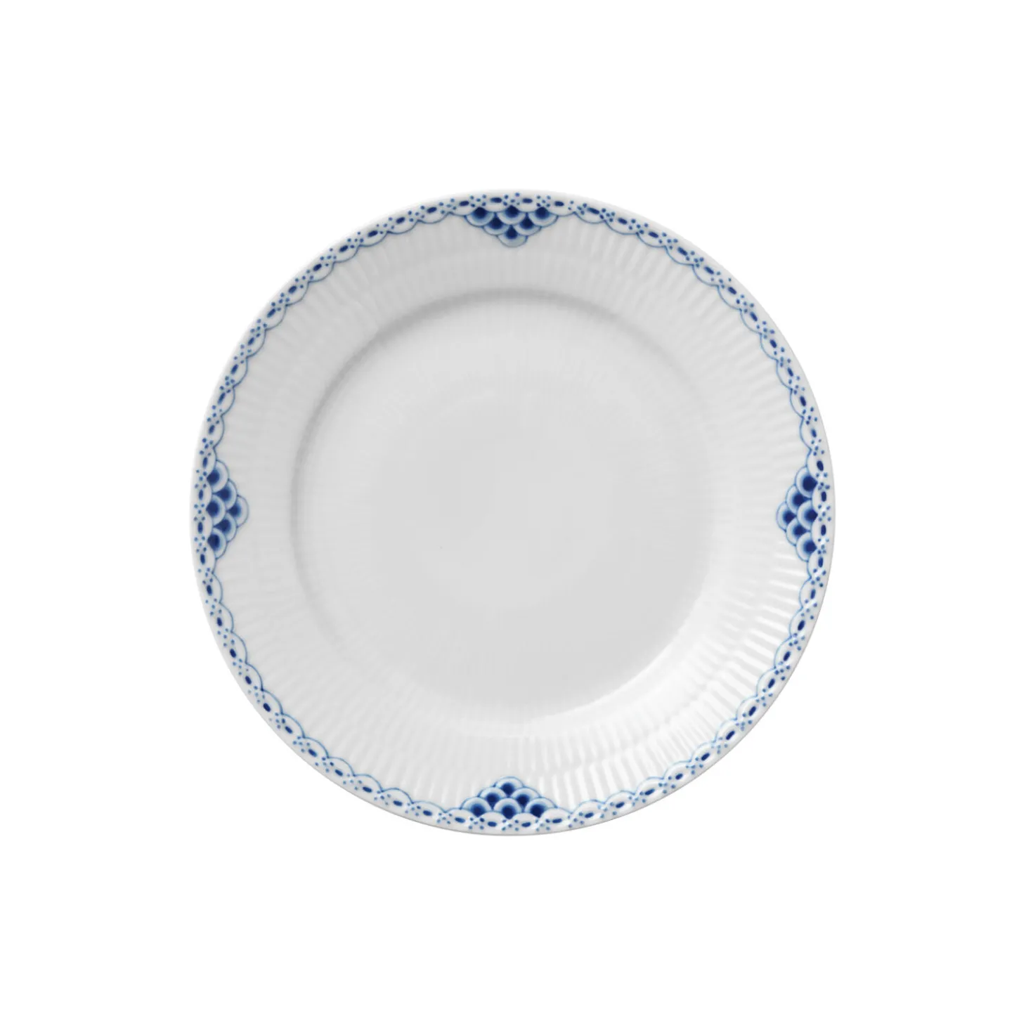 Prinsesse desserttallerken i porcelæn fra Royal Copenhagen. Denne Prinsesse Tallerken på 19 cm prydes af stellets håndmalede blondekant og taktile rifler, som gradvist aftager i størrelse for til sidst at forsvinde og efterlade det blanke, hvide porcelæn. Tallerkenen er ideel både som desserttallerken, frokosttallerken og som et lille serveringsfad.