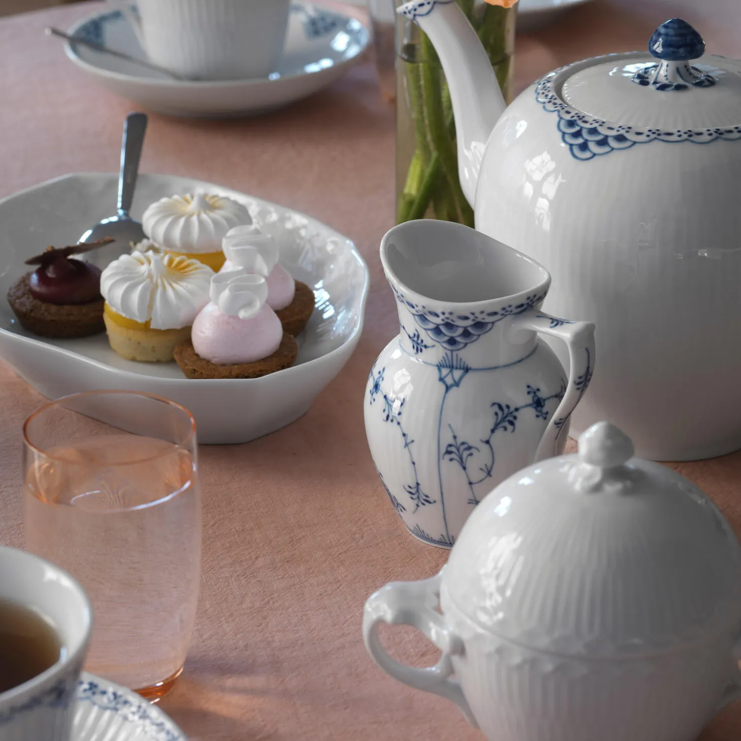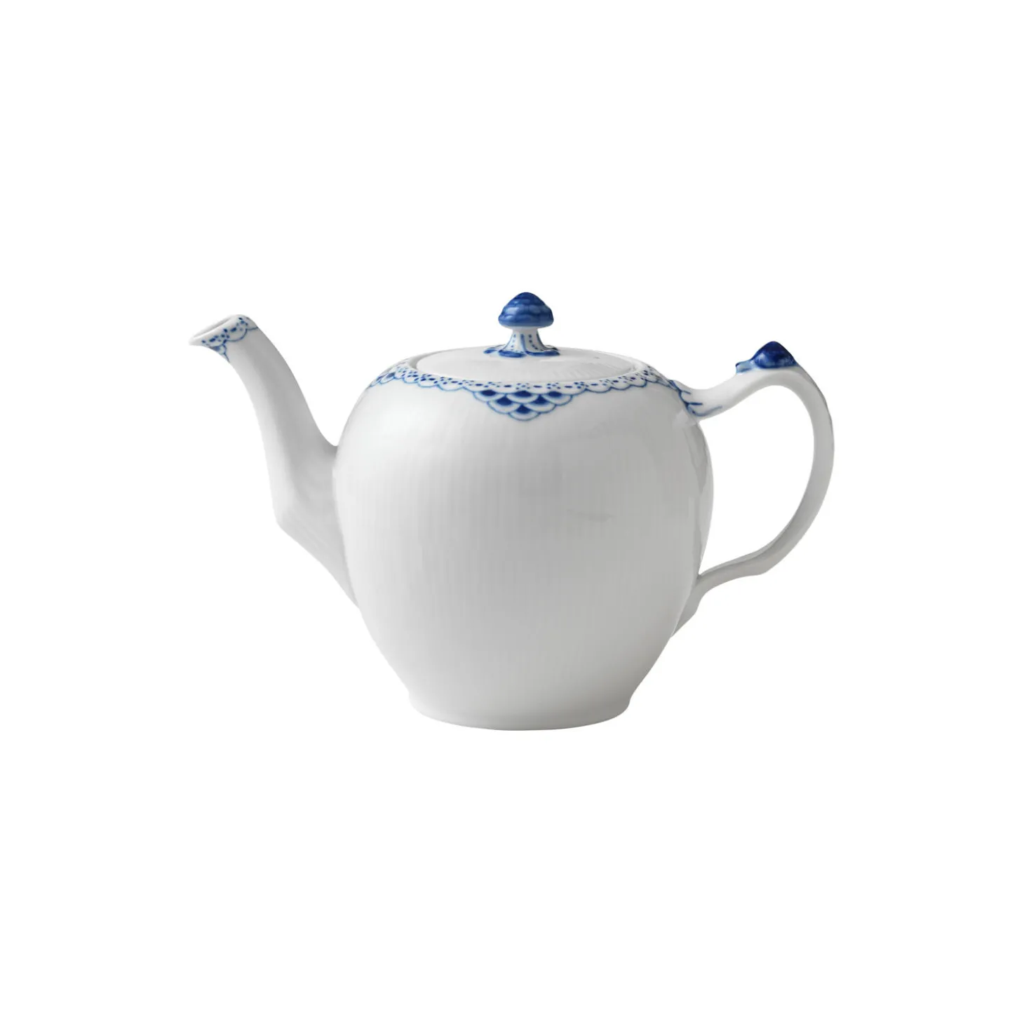 Prinsesse tekande med låg i porcelæn fra Royal Copenhagen. Denne klassiske tekande fra det feminine Prinsesse-stel rummer op til 100 cl og er ideel til te for to eller endda flere. Den vinklede tud er håndmalet med en blå blonde, som også findes rundt om porcelænskandens top, mens låget og hanken er dekoreret med blåmalede sneglehuse. Tekanden kan med fordel kombineres med dele fra andre af Royal Copenhagens serier for et personligt udtryk.