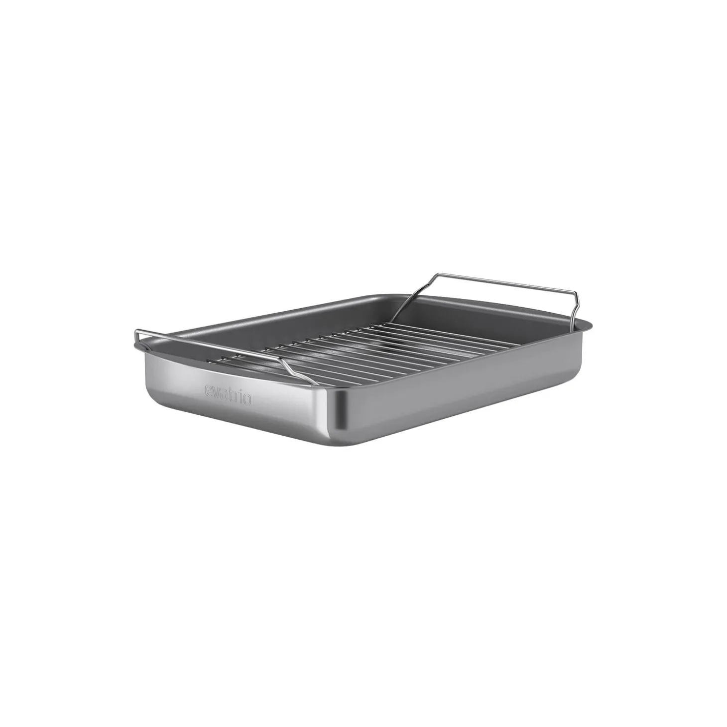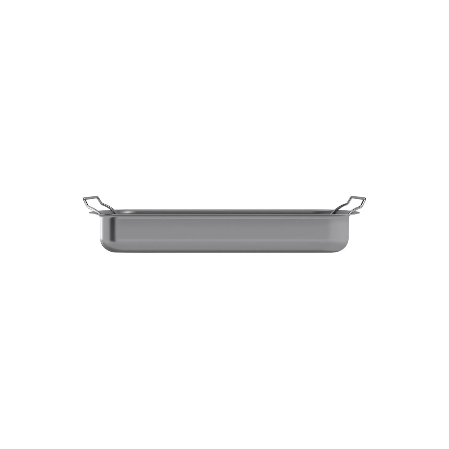 Uanset om I tilbereder grøntsager, steger grillkylling eller bager fisk leverer vores professionelle bradepande det perfekte resultat. Den slidstærke keramiske Slip-let®belægning (helt uden flourstoffer) sikrer, at maden slipper hurtigt og nemt, tåler op til 400 grader og gør rengøringen legende let. Den medfølgende stegerist sørger for, at kød og fjerkræ ligger plant og hævet over bunden. Når maden er færdig, sætter I bare fadet i opvaskemaskinen.