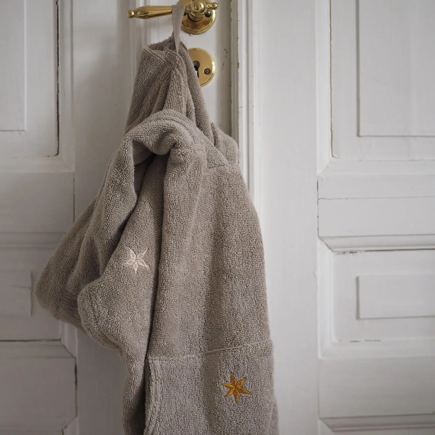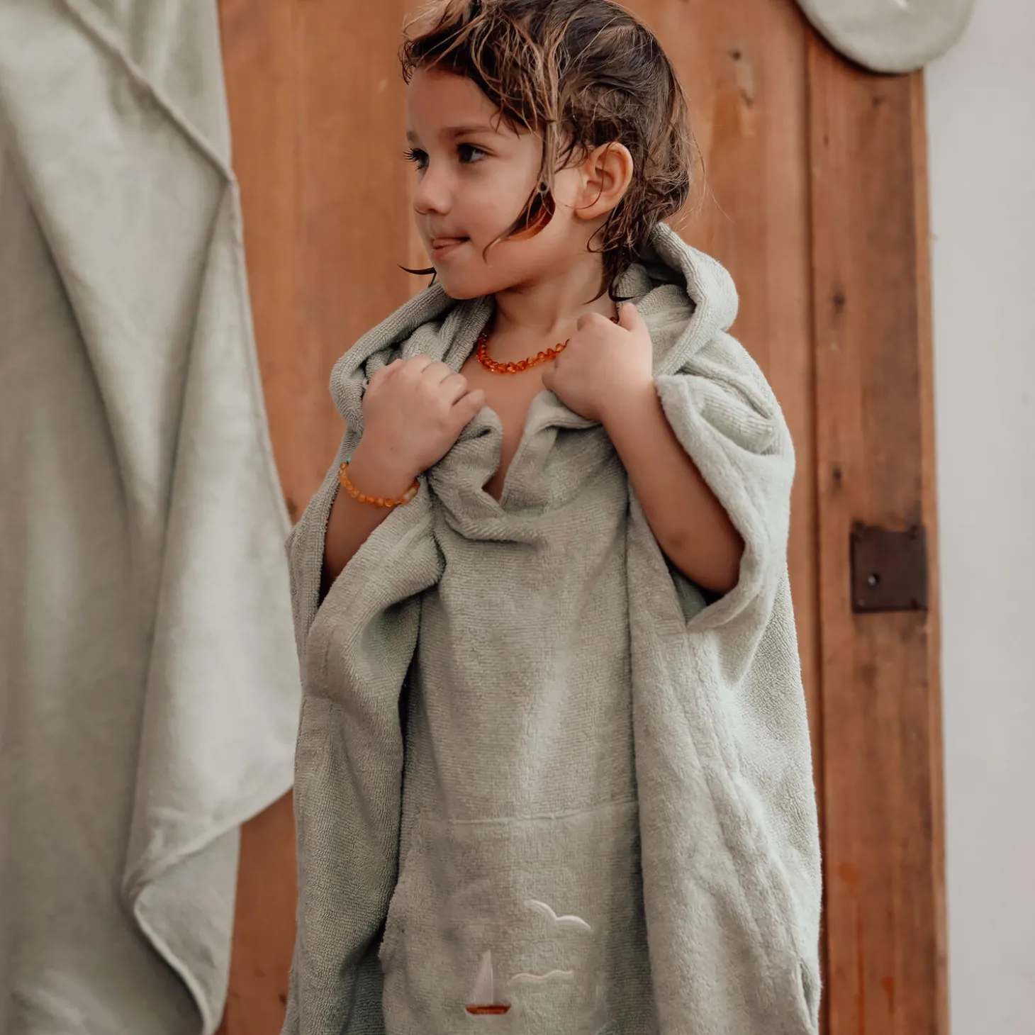 Hyggelig badeponcho i tyk og blød frotté med en fast hætte og kængurulomme. Den er nem at tage over hovedet efter bad eller på stranden. Ponchoen har små, fine broderier, der er inspireret af natur og udeliv.Ponchoen er ONE SIZE. Anbefalet alder ca. 2-6 år.