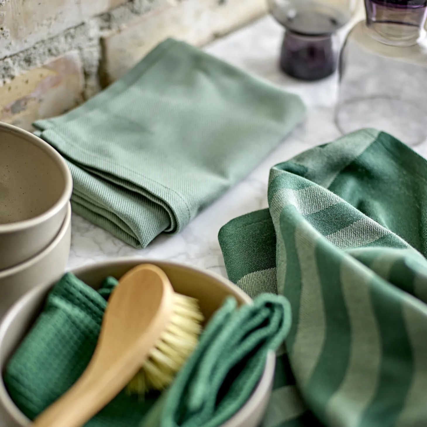 Dette design afspejler vores kærlighed til rene linjer og minimalistisk elegance. Det sofistikerede motiv bestående af lodrette og vandrette striber er både moderne og klassisk. Det grafiske design bliver komplementeret af et viskestykke i en ensfarvet twillvævning.