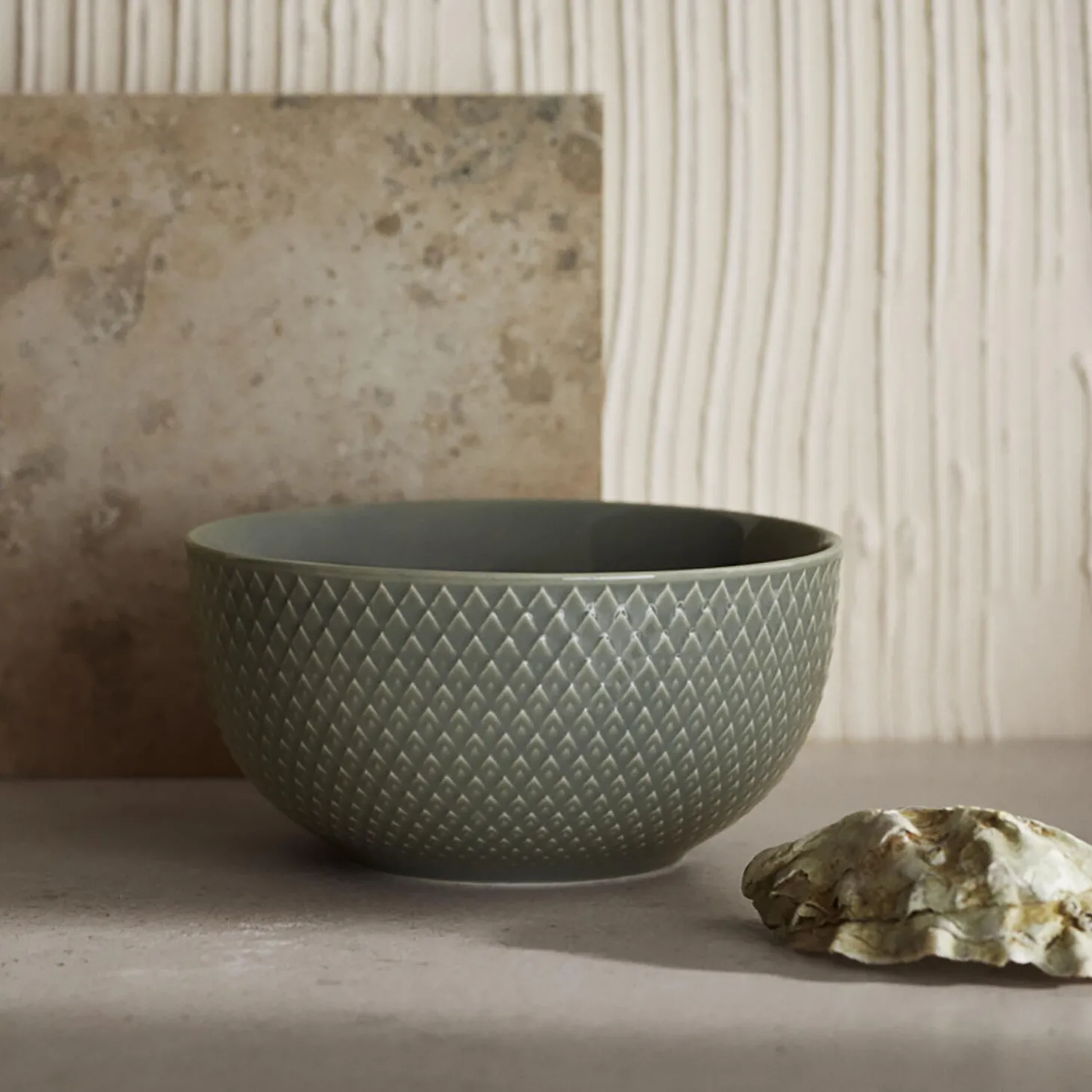 Et jordnært og nærværende udtryk på bordet. Med en farvepalet i fire elegante jordfarver inviterer Rhombe Earth os til at sætte farten ned, være nærværende omkring det vi spiser, dem vi spiser med og at lægge mærke til skønheden i det stel, vi spiser af. Seriens mellemste skål på 13 cm i diameter kommer i to farvevarianter, den beigefarvede marble og denne grågrønne farve moss, der ligesom de to andre afdæmpede jordfarver i Rhombe Earth bringer Rhombe-stellets ikoniske reliefmønster frem på en ny og anderledes måde og indbyder til, at vi går et lag dybere og giver opmærksomhed til maden i skålen, til sanserne og til samtalen med de andre omkring bordet. Alle Rhombe Earth-seriens fire smukke farver – moss, marble, clay og slate – er ligesom i Lyngby Porcelæns populære Rhombe Color-serie nøje udvalgt af designduoen Stilleben, der består af Ditte Reckweg og Jelena Schou Nordentoft. Brug alle de forskellige Rhombe Earth-dele sammen i din borddækning og lad de forskellige størrelser tallerkener titte frem under hinanden, så de lune farver får lov at tale sammen. Tallerkenerne, krusene og skålene i Rhombe Earth er selvfølgelig også både sammen og hver for sig oplagte som supplement til din Rhombe Color-samling eller i kombination med det klassiske hvide Rhombe-stel, hvor de grå og brune nuancer på de enkelte Rhombe Earth-dele sammen med Lyngby Porcelæns linjer til perfektion vil skabe et både moderne og afslappet udtryk og stå smukt op imod det hvide porcelæn.