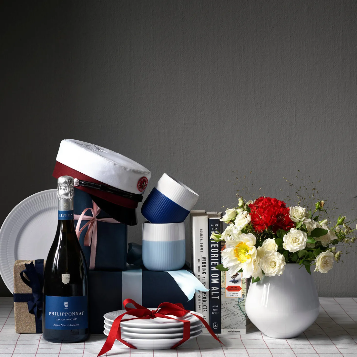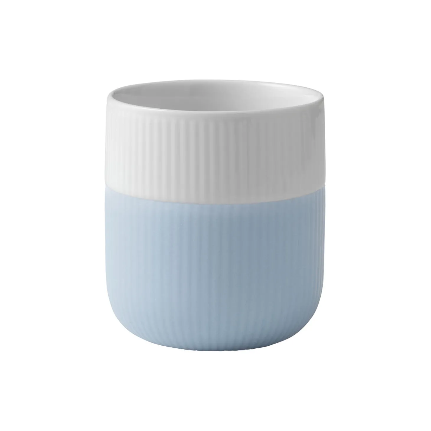 Riflet Contrast krus i porcelæn fra Royal Copenhagen. En blød, lyseblå farve har fundet vej til dette Riflet Contrast krus og skaber en rolig harmoni mellem silikonen og det hvide porcelæn. Taktile rifler præger kruset på 35 cl som blandt andet kan bruges som kaffekrus eller tekrus.
