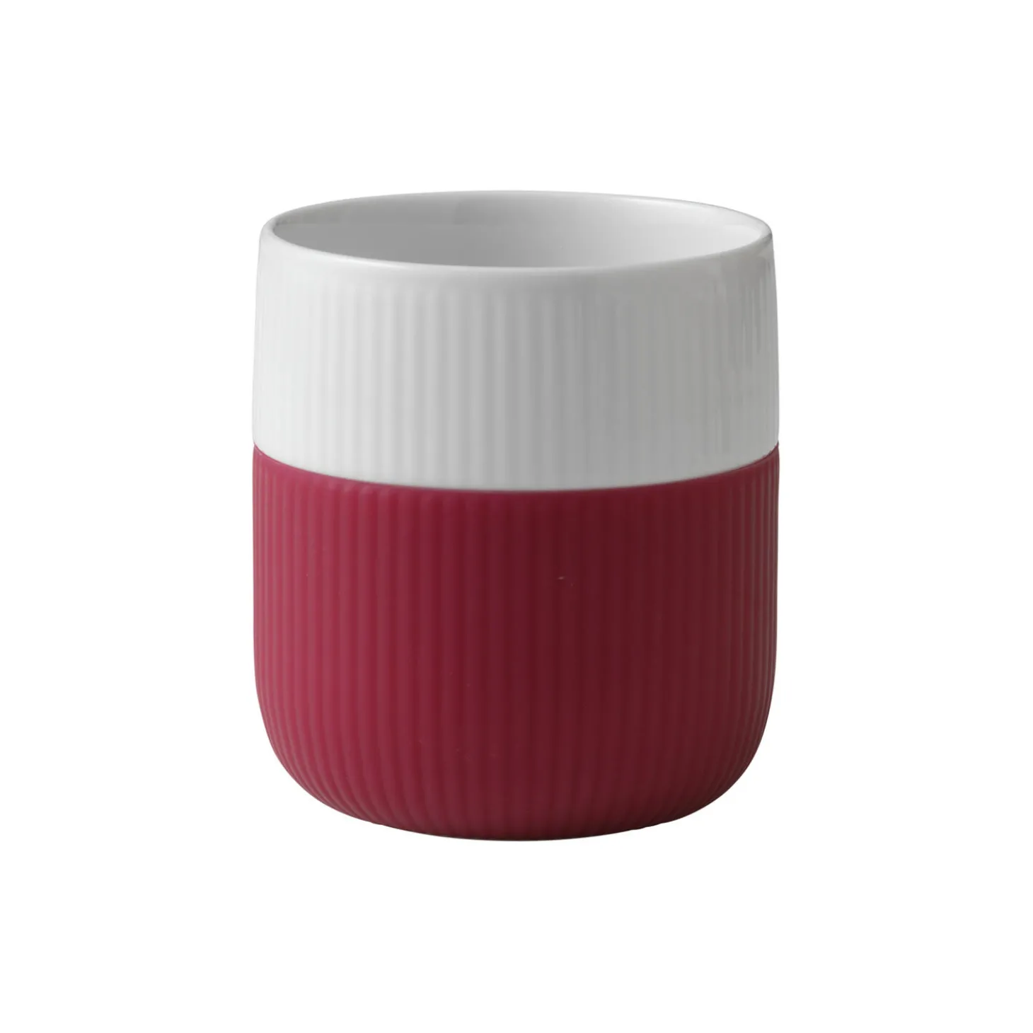 Riflet Contrast krus i porcelæn fra Royal Copenhagen. Sommerens friske hindbær har inspireret den dybrøde farve på dette Riflet Contrast Krus på 35 cl. Krusets enkle form prydes af taktile rifler, som gengives på den bløde silikone, der holder varmen fra krusets overflade. Det smukke krus er ideelt til kaffe og te.