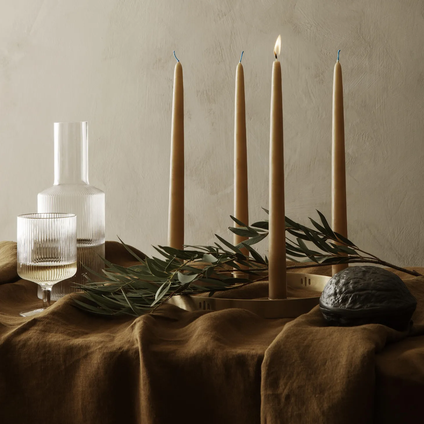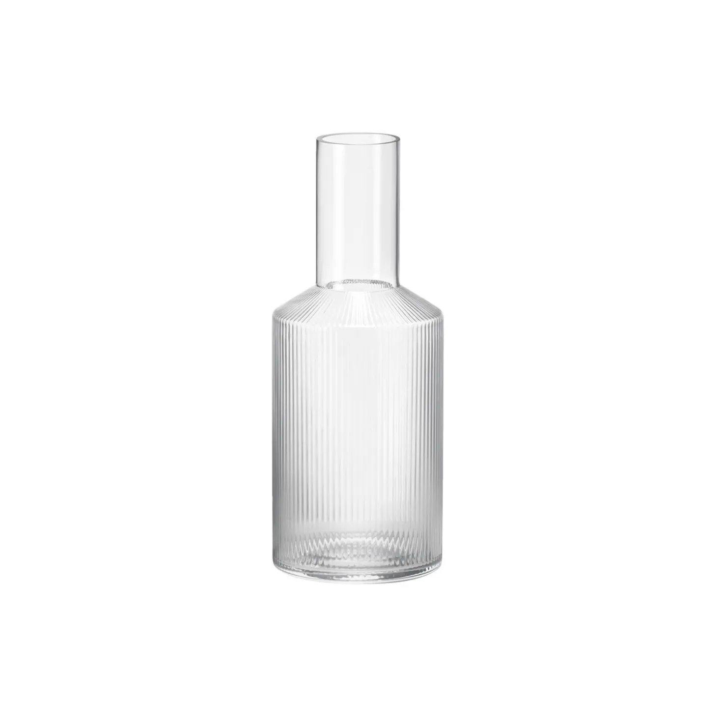 Denne praktiske og smukke karaffel er mundblæst i et riflet, moderne design. Brug karaflen til vand, juice eller drinks, og byd dine gæster på en stilfuld servering med det tilhørende glas.
