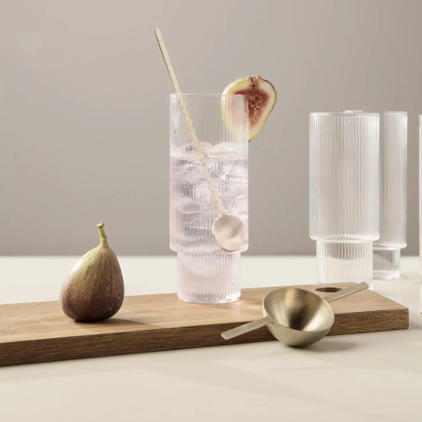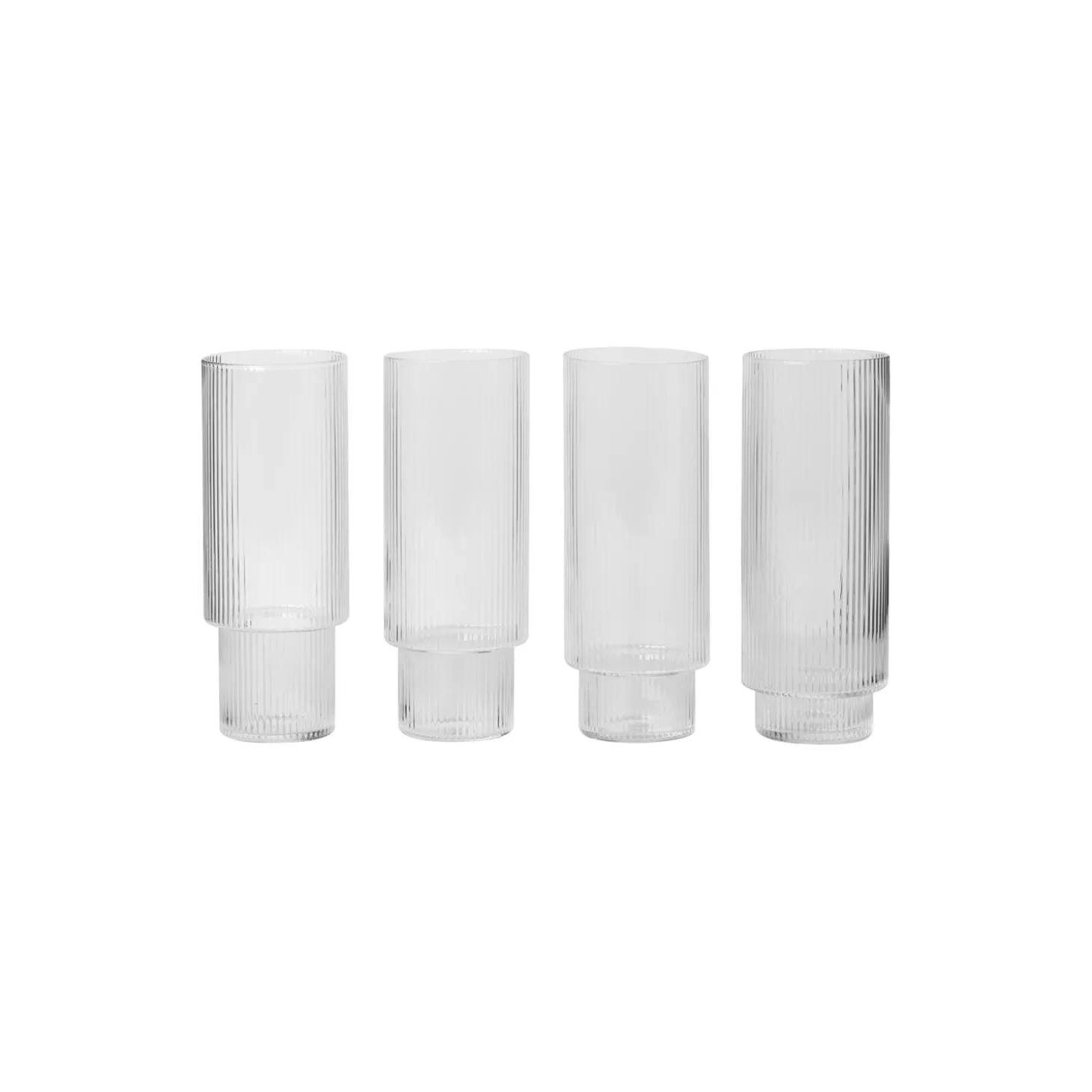 Ved at kanalisere en sofistikeret følelse med deres rillede overflade på det mundblæste glas gør disse drinksglas sig til en naturlig del af enhver aften i godt selskab. Fire forskellige geometriske former udgør fundamentet i denne dynamiske glasserie, som på én gang er smuk og funktionel. Server din yndlingsdrink i glassene og oplev, hvordan et funklede spil af lys og struktur opstår i glassets overflade.