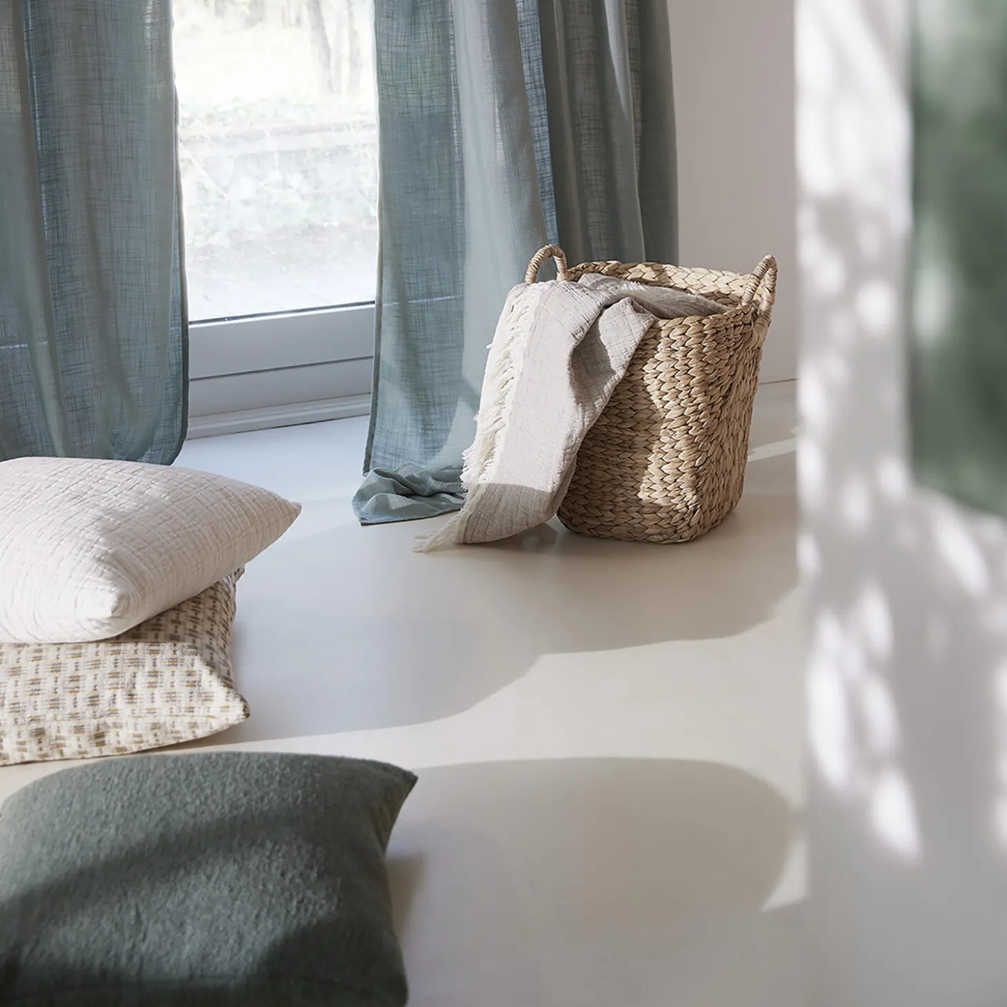 Pude i trendy crinkled bomuld, som matcher med Compliments River sengetæppe og River plaider. Alle STANDARD 100 by OEKO-TEX® certificeret. Puden leveres med 100% andedun/-fjer og pudevår i 100% bomuldsbetræk.