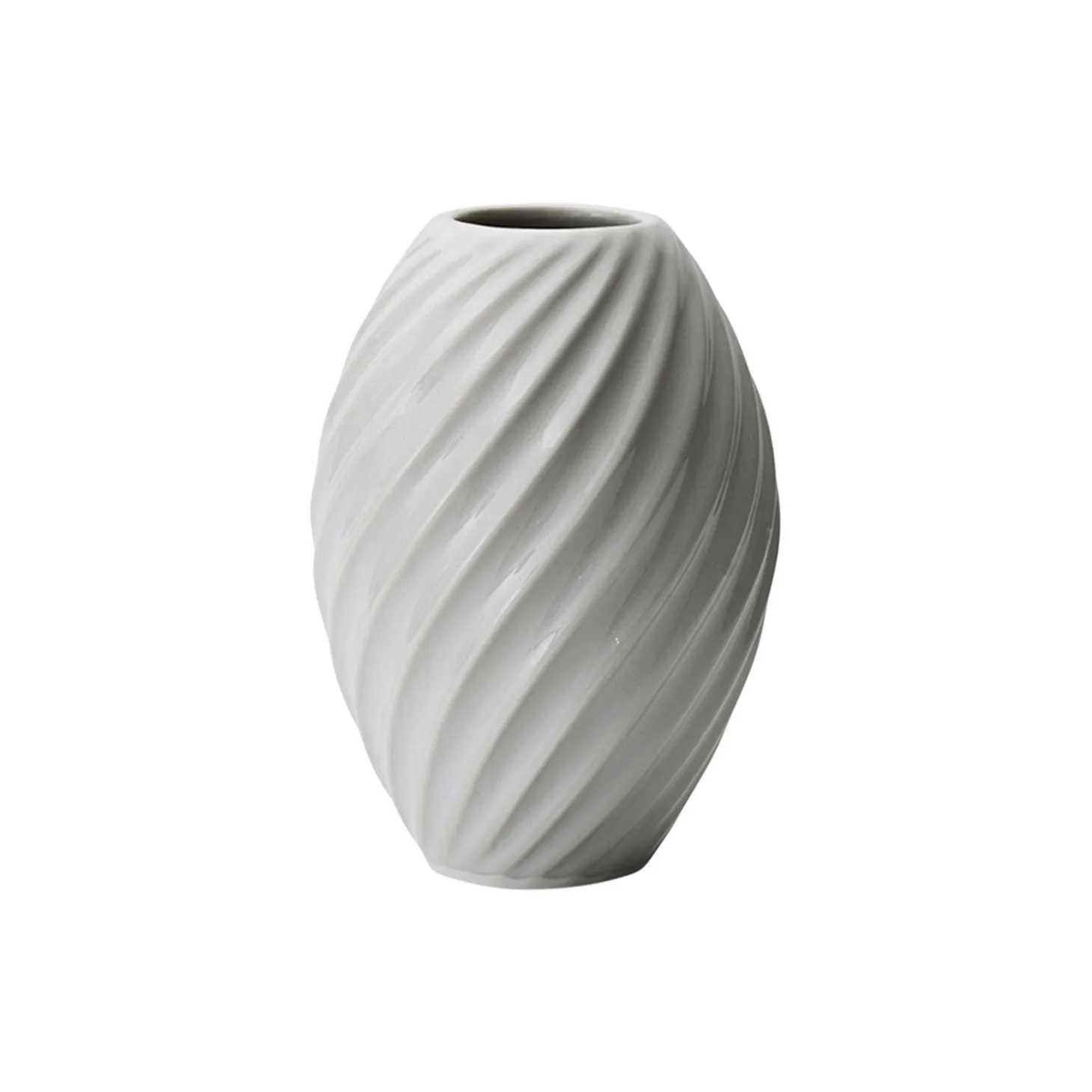 Som lette krusninger på vand snor det smukke diagonale spiralmønster sig elegant om de slanke vaser og giver dem et spændende stramt, grafisk udtryk. Udført i porcelæn og glaseret med en smuk gråblå glasur, der på flotteste vis understreger vasens form, som er tilpasset til roser, afskårne blomster fra haven og forårsgrene.
