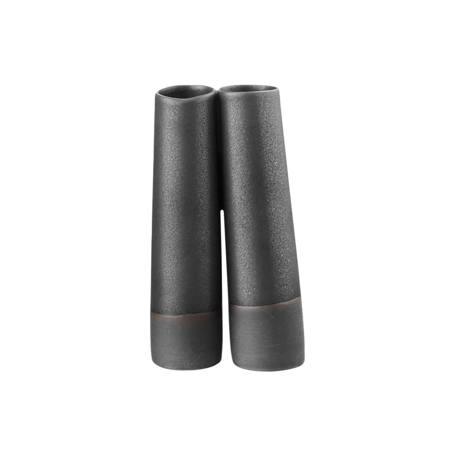 Rørvase med to skæve porcelænsrør i forskellig højde, der læner sig mod hinanden. Gør sig rigtig godt med en enkelt blomst fra grøftekanten eller den ene blomst der stadig er frisk, når du smider en buket ud. Vaserne er forskellige – højde og hældning varierer. Støbt i indfarvet porcelæn og forarbejdet i hånden. Fremstillet hos Ditte Fischer i København.