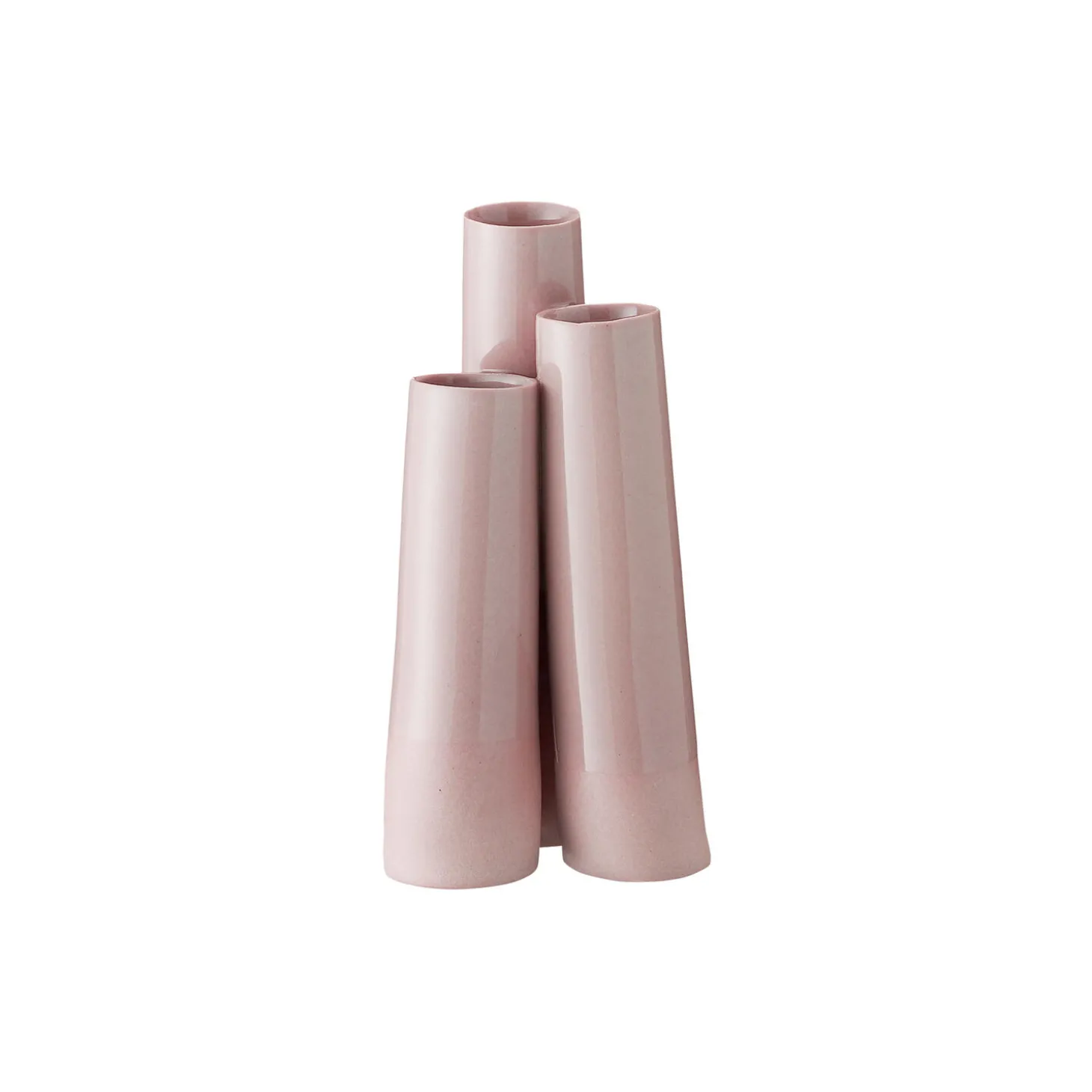 Rørvase støbt i indfarvet porcelæn og forarbejdet i hånden. En uhøjtidelig lille vase med tre skæve porcelænsrør i forskellig højde, der læner sig mod hinanden. Gør sig rigtig godt med en enkelt blomst. Vaserne er forskellige – højde og hældning varierer. Fremstillet hos Ditte Fischer i København.