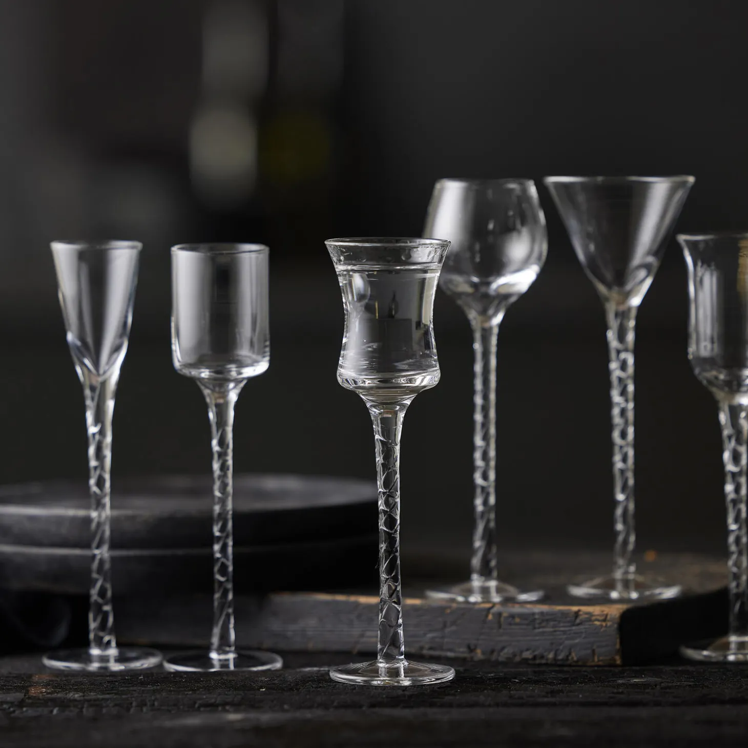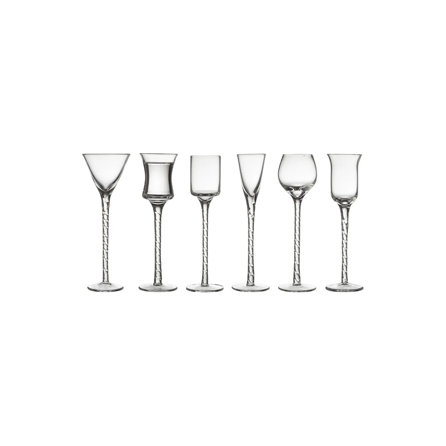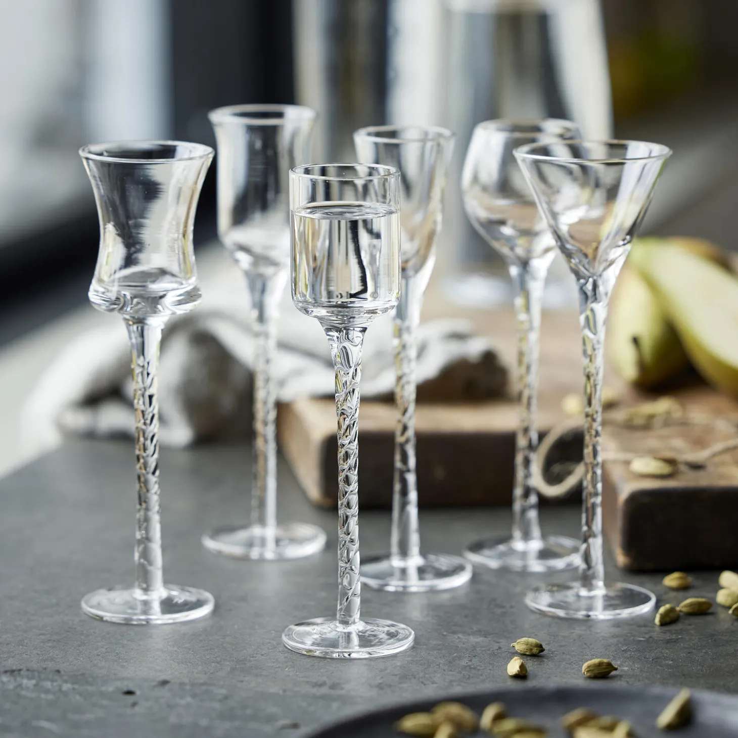 6 forskellige mundblæste snapseglas med snoet stilk bidrager til en god stemning ved bordet, og det er nemt at finde sit eget glas. Snapseglassene i klart glas har forskellige udformninger og indeholder fra 2,5 op til 5 cl.