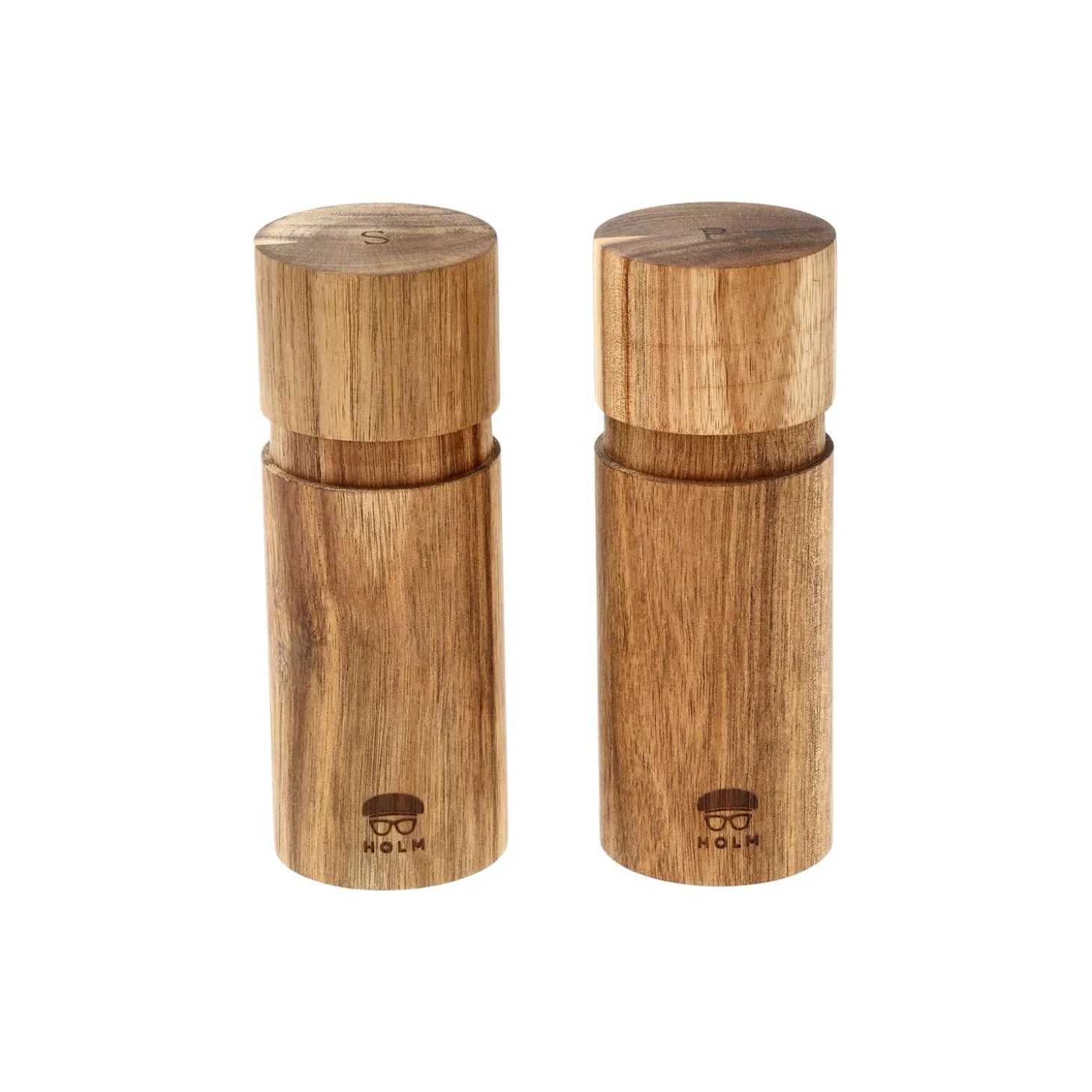 Flot salt- og peberkværnsæt i akacietræ med keramisk kværnindsats. Kværnene har et maskulint udtryk, og deres indhold af salt og peber er markeret med et diskret S eller P på toppens. Du kan selv bestemme, hvor groft eller fint du ønsker at kværne. Malingsgraden justeres nemt i bunden af kværnen.Kværnene kan med fordel efterbehandles med madolie et par gange om året for at bevare træets varme glød. 15,2 cm høj.Varen er produceret i FSC®-certificeret akacietræ (FSC-C166612).