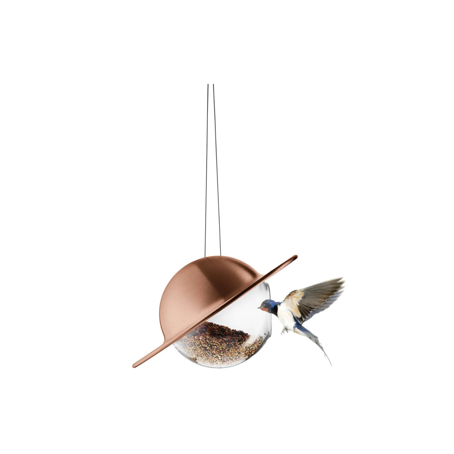 Inviter nabolagets fugle til en fornem middag. Fuglefoderkuglen er forsynet med et dekorativt halvtag, som ikke alene holder foderet tørt, men også forhindrer større fugle i at snuppe maden fra de mindre. Takket være kuglens gennemsigtige glasbund kan du nemt holde øje med, hvornår det er tid til at genopfylde fuglefoder – selv på afstand. Du behøver heller ikke bekymre dig om vedligeholdelse; materialerne er vejrbestandige og designet til at modstå al slags vejr hele året rundt. Vær opmærksom på, at kobberet naturligt vil oxidere og få en smuk patina med tiden. Ønsker du at beholde det blanke look, kan foderautomaten pudes med almindeligt kobberpudsemiddel.
