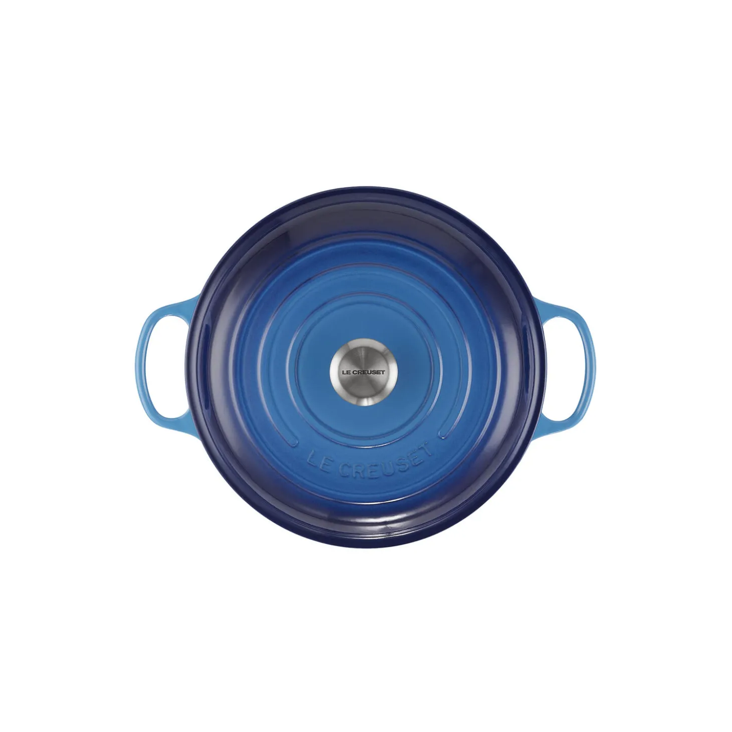Vores støbejernsprodukter fremstilles på vores eget franske støberi og er vaskeægte køkkenlegender. Denne buffetgryde er ingen undtagelse. Den store, flade form og de lave kanter gør den perfekt til at brune kød og grøntsager, simre gryderetter, lynstege og bage. Den karamelliserer maden effektivt, så du får velsmagende resultater. Låg med rustfri stål- eller fenolknop tåler opvaskemaskine. Låg med guld-, iriserende-, kobber- og sort nikkelknop skål håndvaskes for at bevare deres finish. Egnet til følgende varmekilder: ovnens grill, ovn, elektrisk, keramisk kogeplade, gas og induktion.
