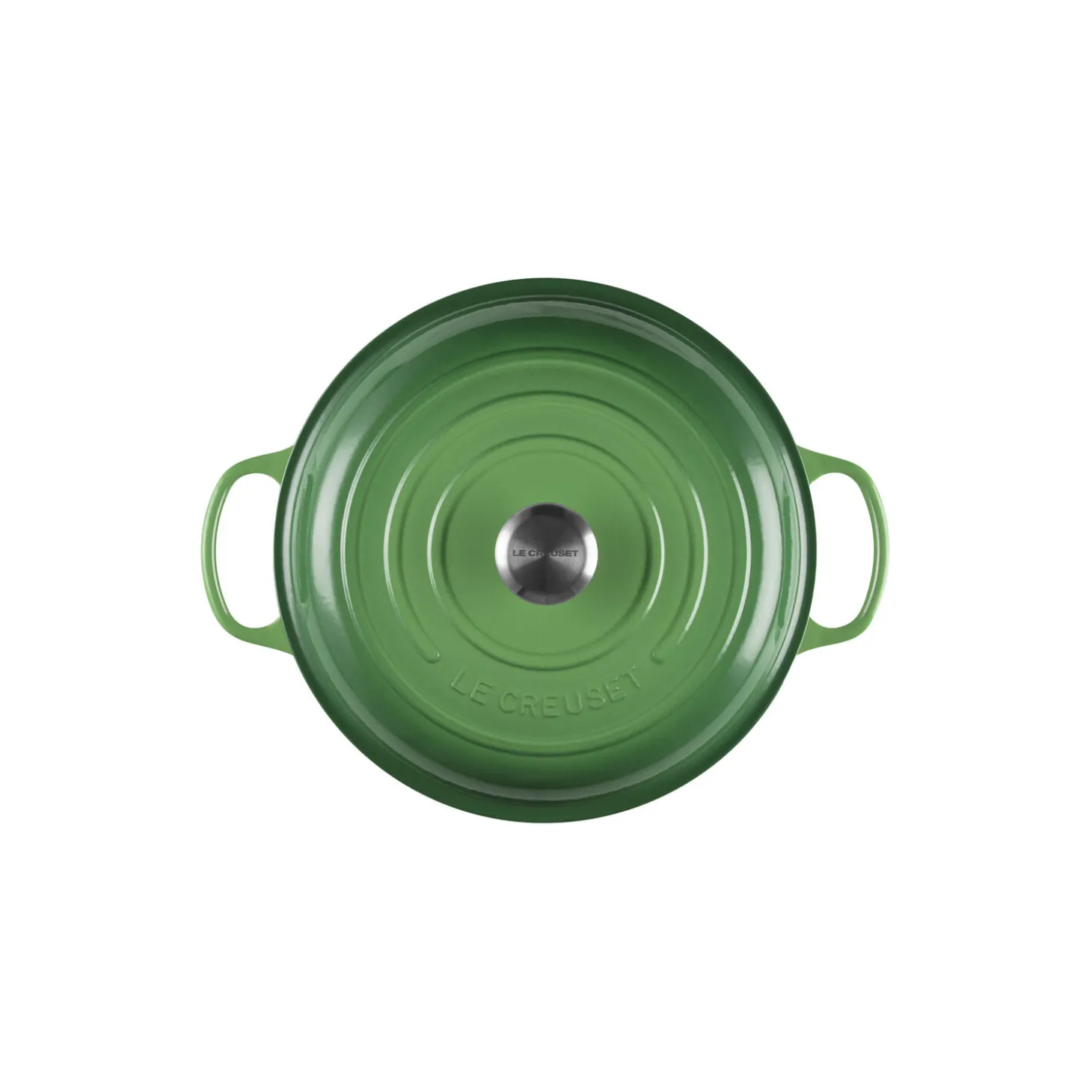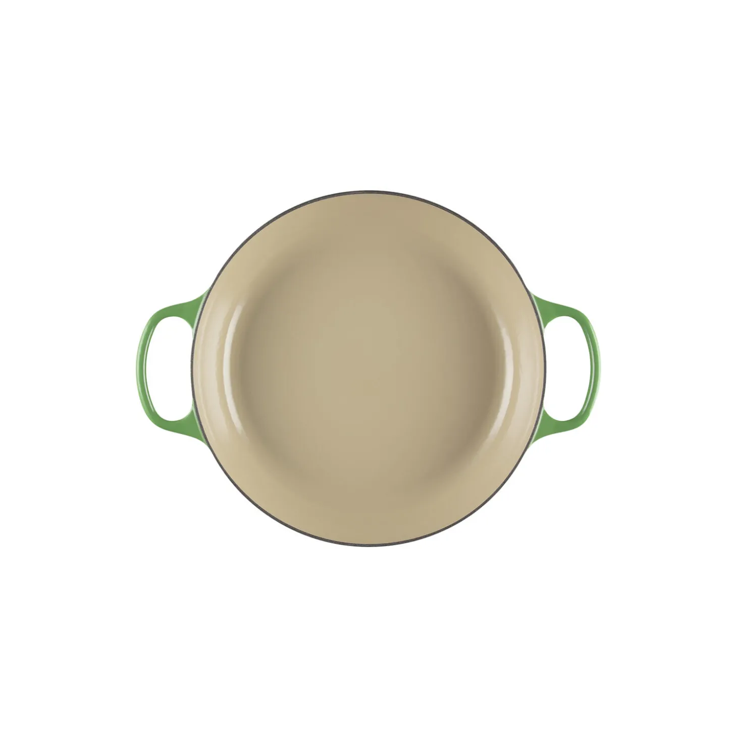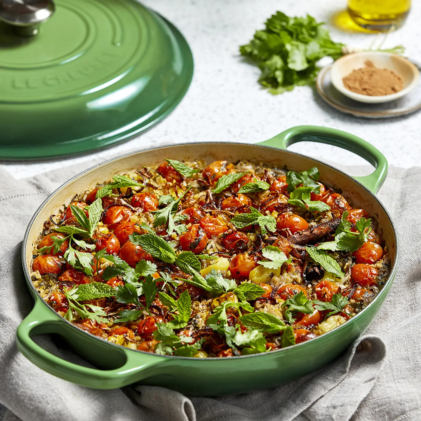 Vores støbejernsprodukter fremstilles på vores eget franske støberi og er vaskeægte køkkenlegender. Denne buffetgryde er ingen undtagelse. Den store, flade form og de lave kanter gør den perfekt til at brune kød og grøntsager, simre gryderetter, lynstege og bage. Den karamelliserer maden effektivt, så du får velsmagende resultater. Låg med rustfri stål- eller fenolknop tåler opvaskemaskine. Låg med guld-, iriserende-, kobber- og sort nikkelknop skål håndvaskes for at bevare deres finish. Egnet til følgende varmekilder: ovnens grill, ovn, elektrisk, keramisk kogeplade, gas og induktion.
