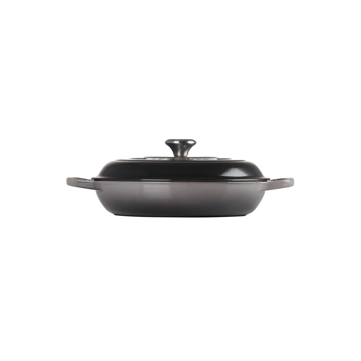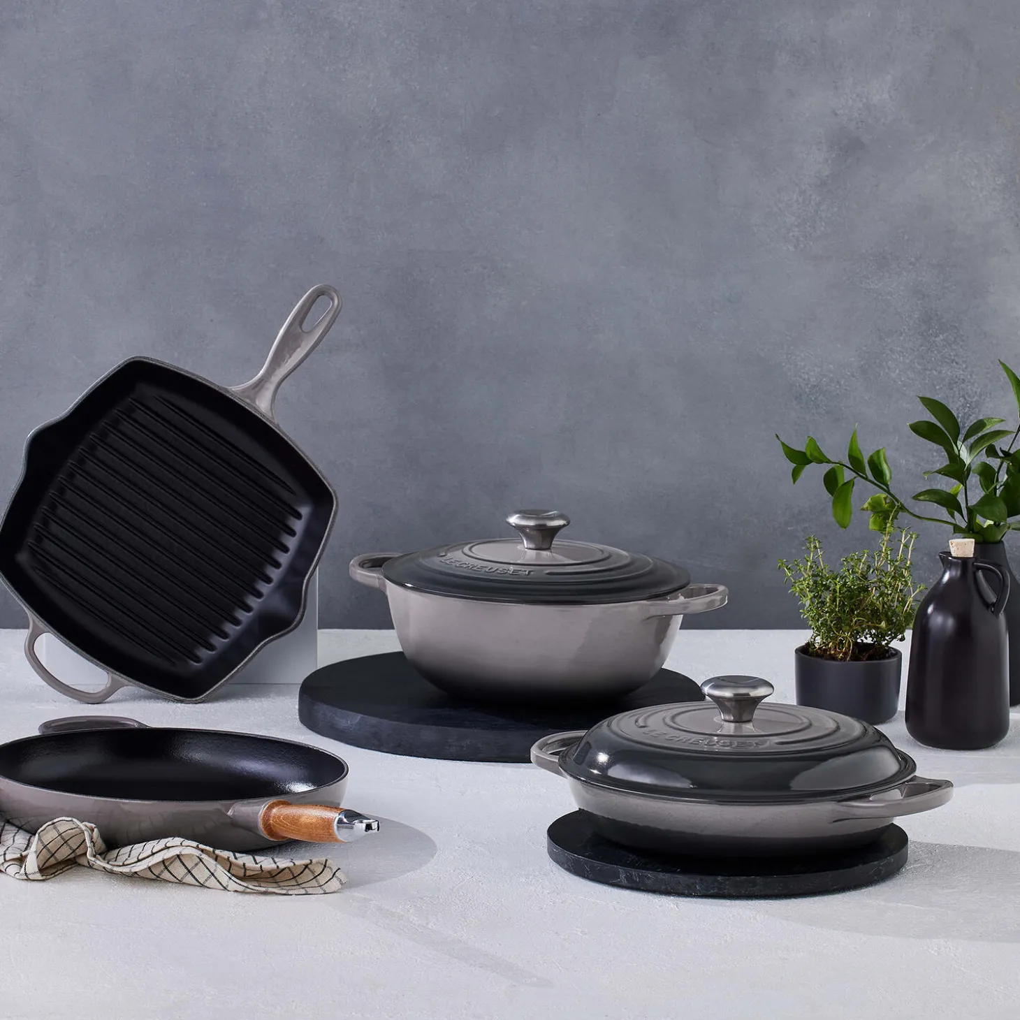 Vores støbejernsprodukter fremstilles på vores eget franske støberi og er vaskeægte køkkenlegender. Denne buffetgryde er ingen undtagelse. Den store, flade form og de lave kanter gør den perfekt til at brune kød og grøntsager, simre gryderetter, lynstege og bage. Den karamelliserer maden effektivt, så du får velsmagende resultater. Låg med rustfri stål- eller fenolknop tåler opvaskemaskine. Låg med guld-, iriserende-, kobber- og sort nikkelknop skål håndvaskes for at bevare deres finish. Egnet til følgende varmekilder: ovnens grill, ovn, elektrisk, keramisk kogeplade, gas og induktion.