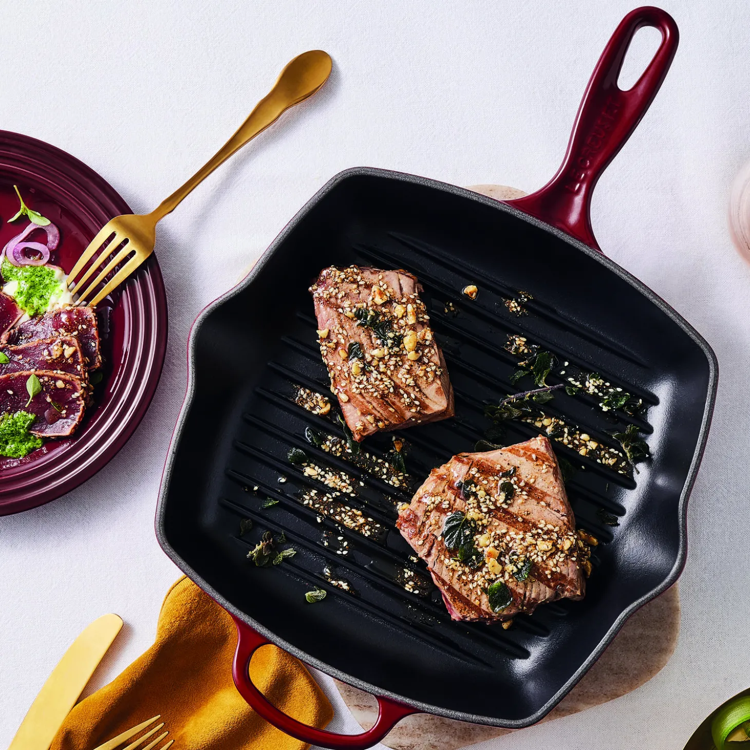 Vores kendte grillpande i støbejern forsegler hurtigt overfladen på din mad og holder på den gode saft og smag. Den er perfekt til lækker og sund madlavning – fedtet ledes simpelthen væk og samles mellem rillerne. Dette alsidige produkt vil også gøre det nemt for dig at tilberede hurtige måltider med kød, fisk og grøntsager. Egnet til følgende varmekilder: ovnens grill, ovn, elektrisk, keramisk kogeplade, gas og induktion.