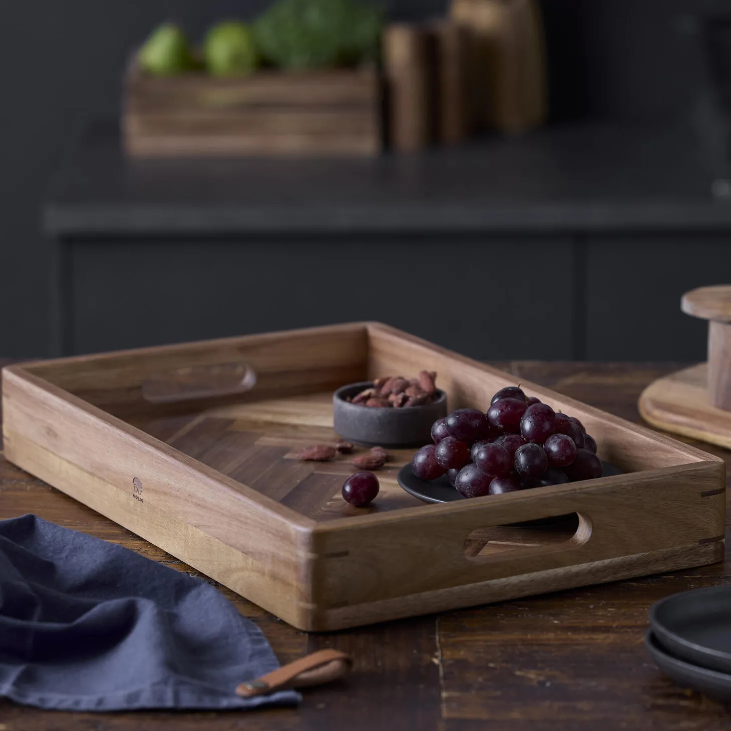 Flot bakke i akacietræ med elegant sildebensmønster. Den høje kant og de praktiske bærehåndtag gør bakken perfekt til flot servering af morgenmad, snacks eller drikkevarer. 40 x 30 cm.Læg aldrig bakken i blød, men tør den i stedet over med en fugtig klud. Tåler ikke maskinopvask.Varen er produceret i FSC®-certificeret akacietræ (FSC-C166612).