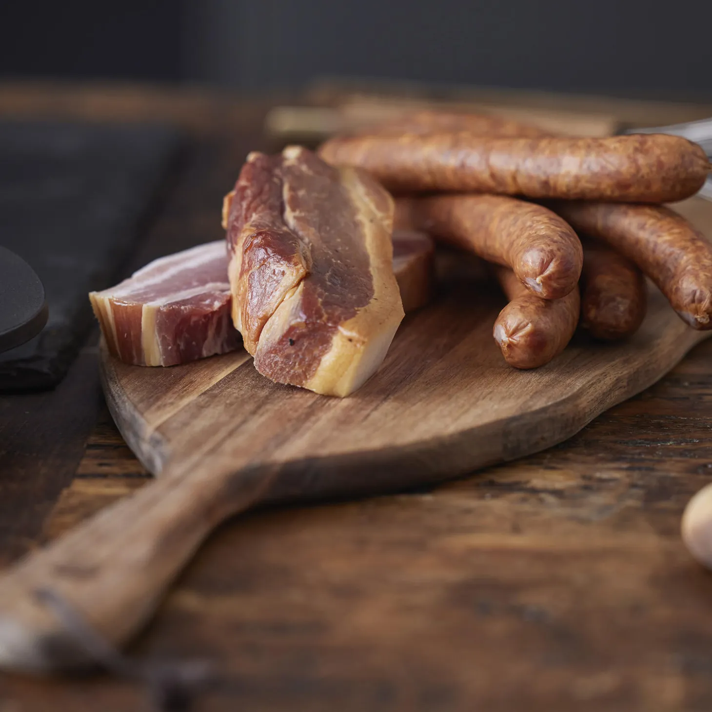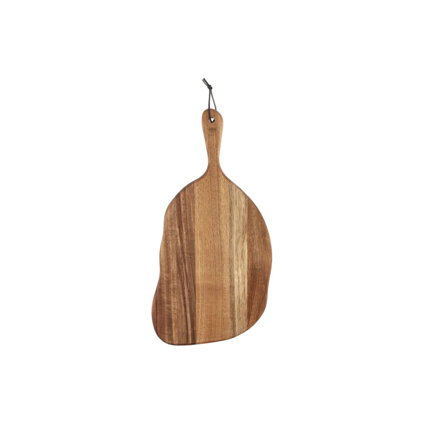 Serveringsbræt med bløde organiske former fremstillet i akacietræ. Brættet er ideelt til servering af ost, tapasretter og andre anretninger eller som skærebræt under tilberedning af måltidet. Med ophængshul og strop. 44 x 22,7 x 1,5 cm.Varen er produceret i FSC®-certificeret akacietræ (FSC-C166612).