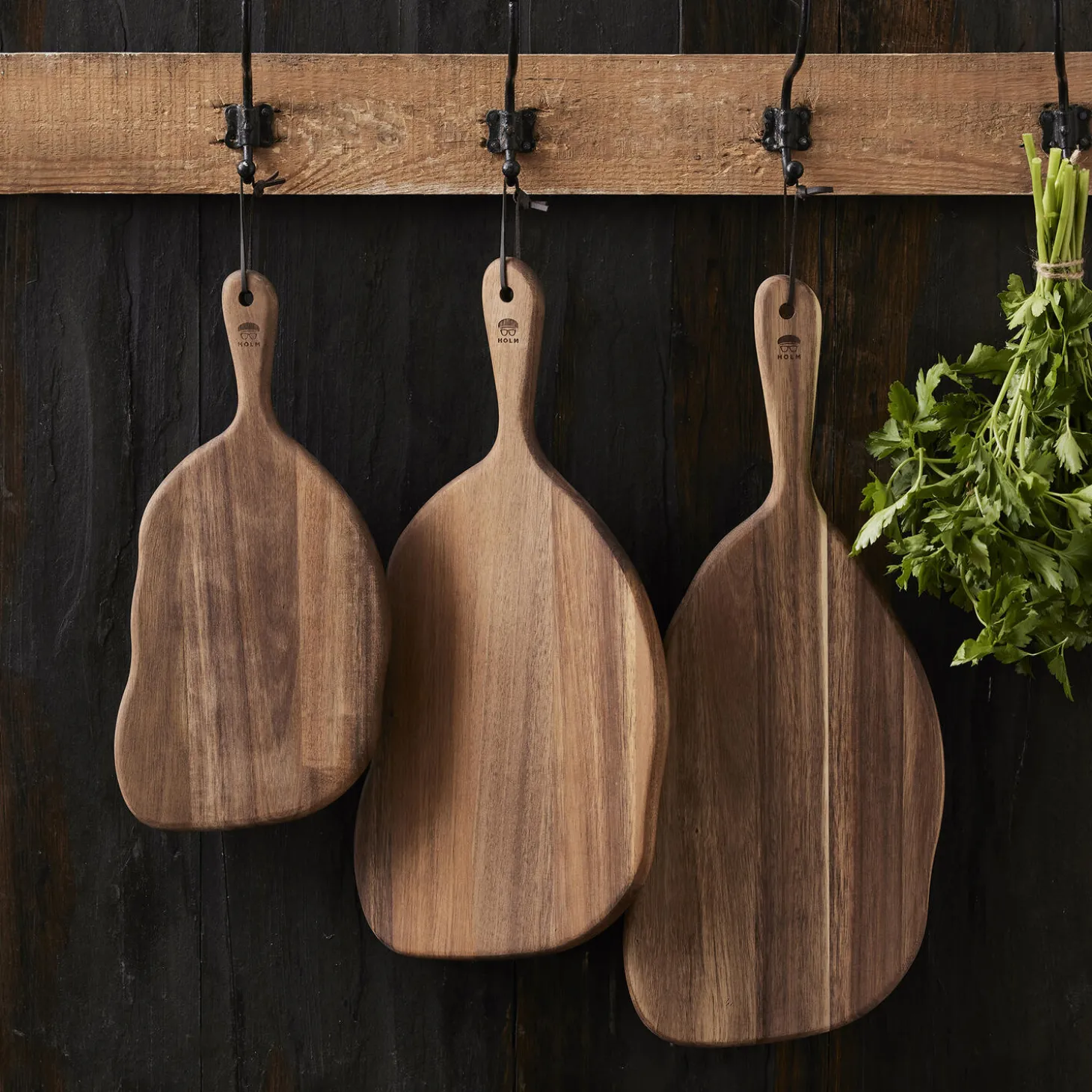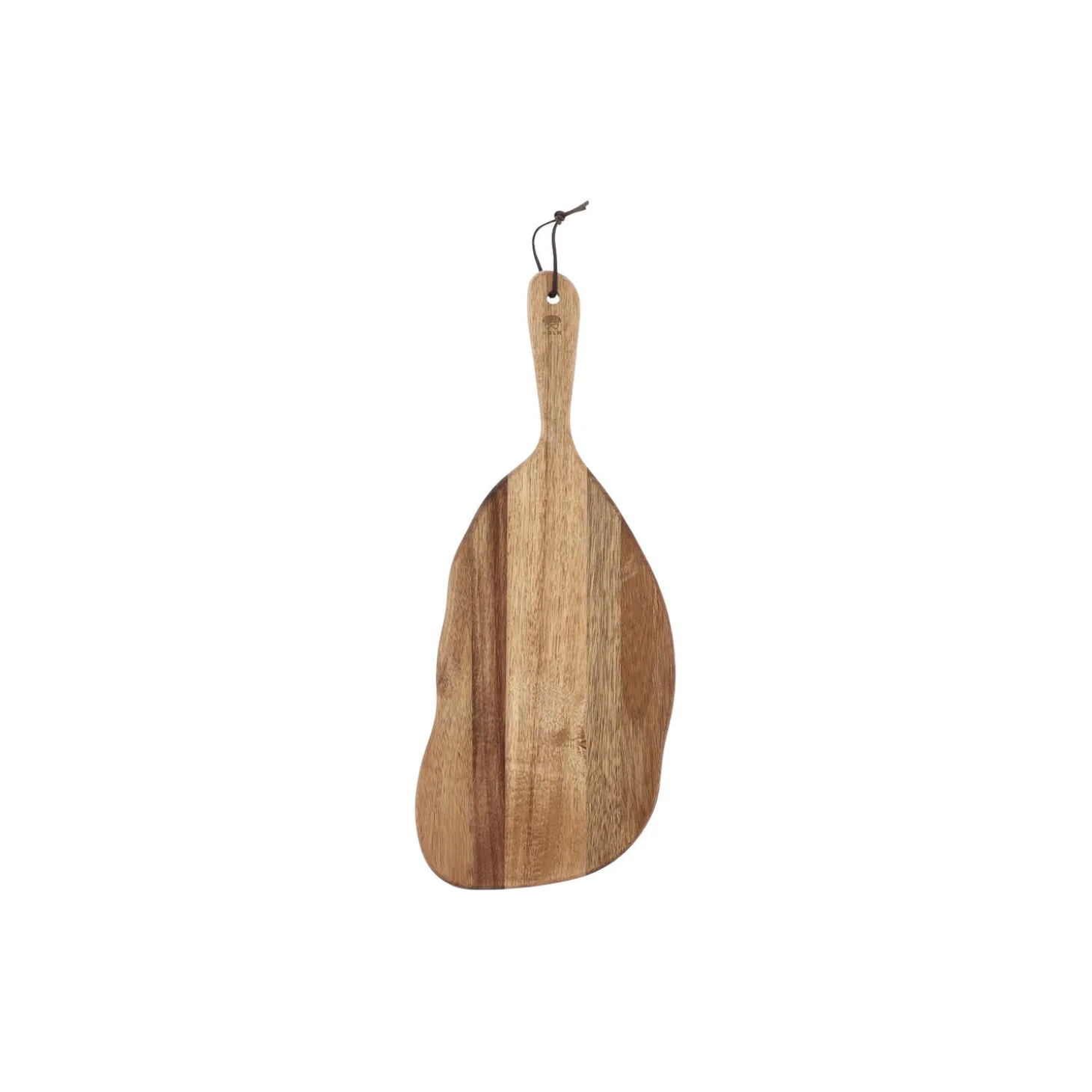 Serveringsbræt med bløde organiske former fremstillet i akacietræ. Brættet er ideelt til servering af ost, tapasretter og andre anretninger eller som skærebræt under tilberedning af måltidet. Med ophængshul og strop. 48 x 20,3 x 1,5 cmVaren er produceret i FSC®-certificeret akacietræ (FSC-C166612).