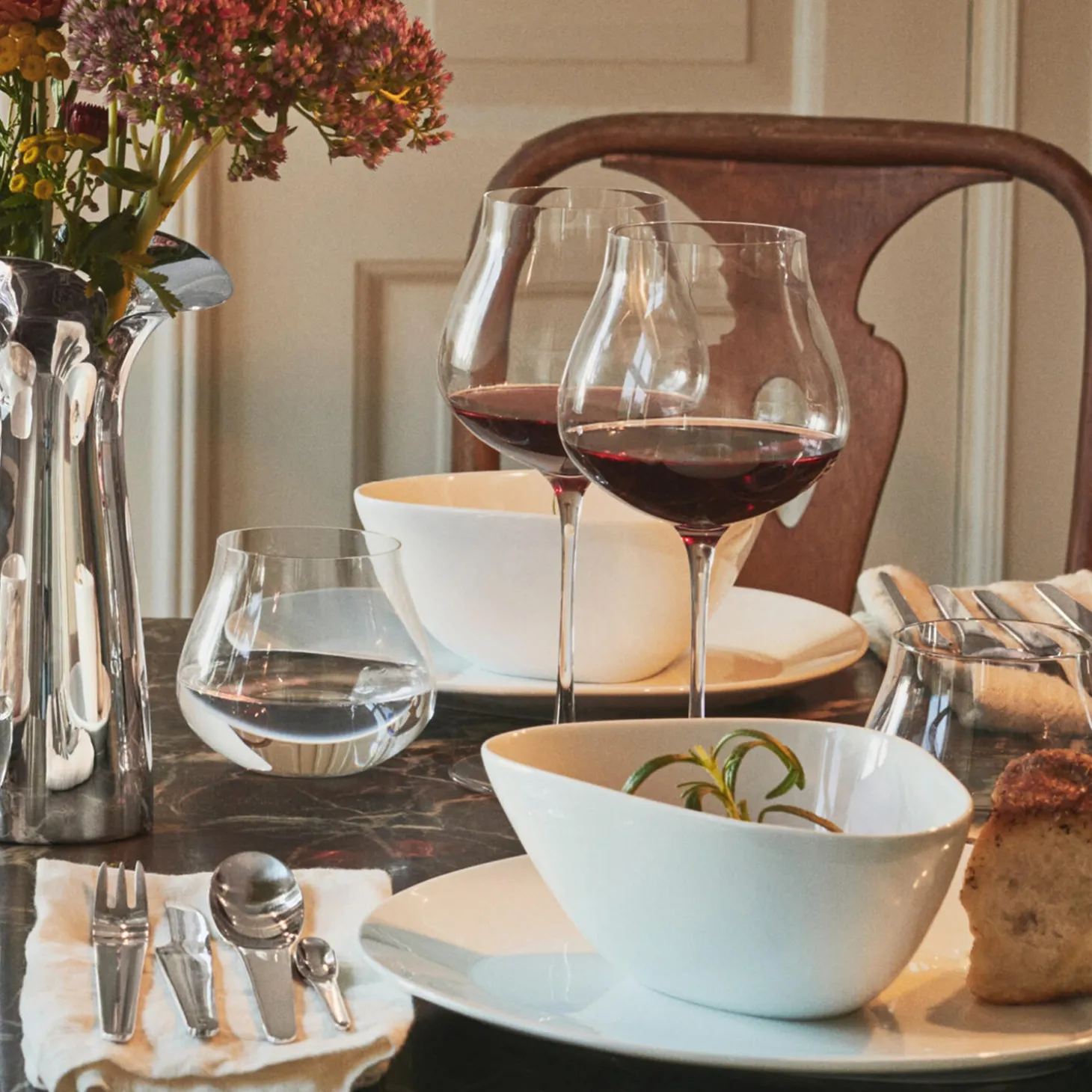 De skulpturelle Sky rødvinsglas serverer vinen med moderne elegance. Det minimalistiske design i blyfrit krystalglas er både smukt til hverdag og ved særlige lejligheder, og glassene skaber et let udtryk på bordet med deres enkle linjer. Rødvinsglassene er elegante i kombination med tallerkener og andre glas fra Sky kollektionen, og du kan fuldende serveringen med Sky kollektionens vinkaraffel i moderne skandinavisk design.
