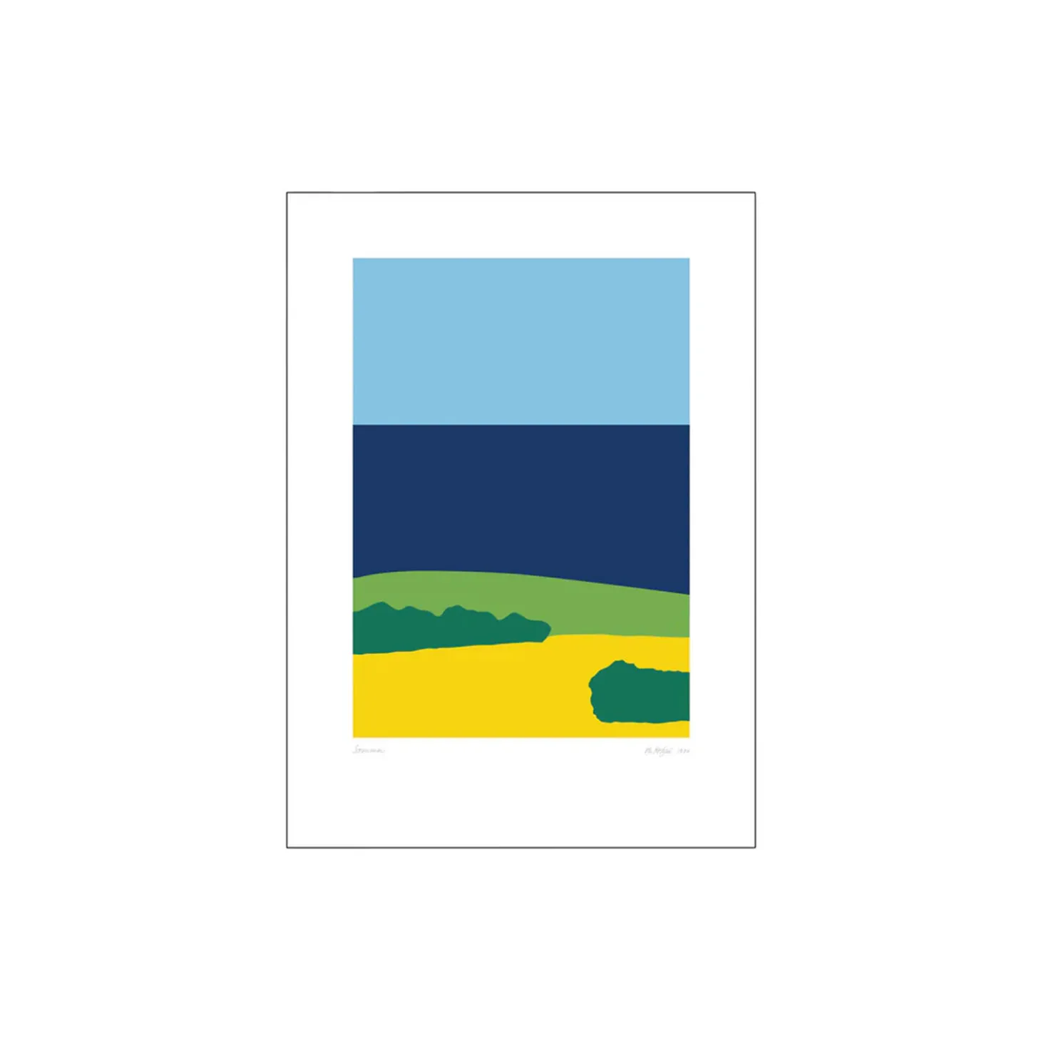 Kunstplakaten er en reproduktion af det originale kunstværk Sommer, som blev serigrafitrykt i 1974. I Danmark er vi aldrig mere end 60 km fra kysten.