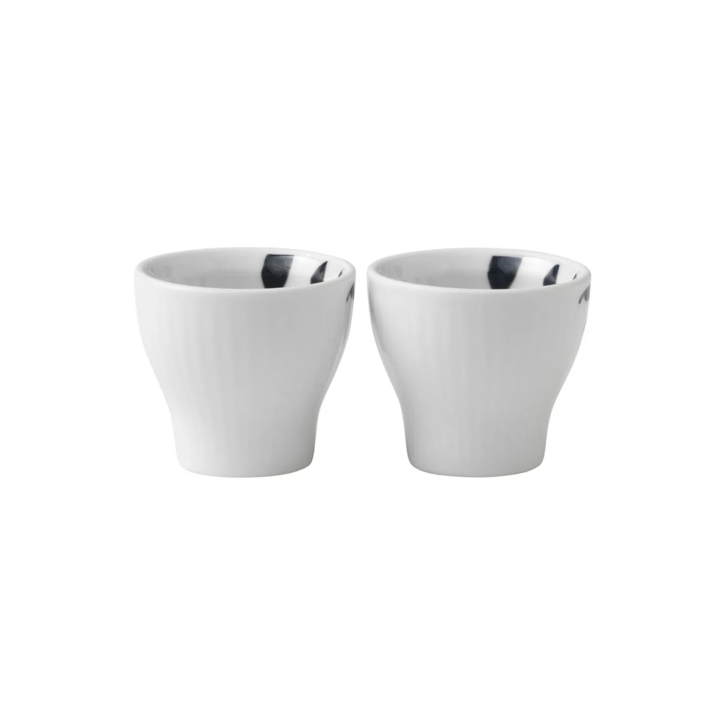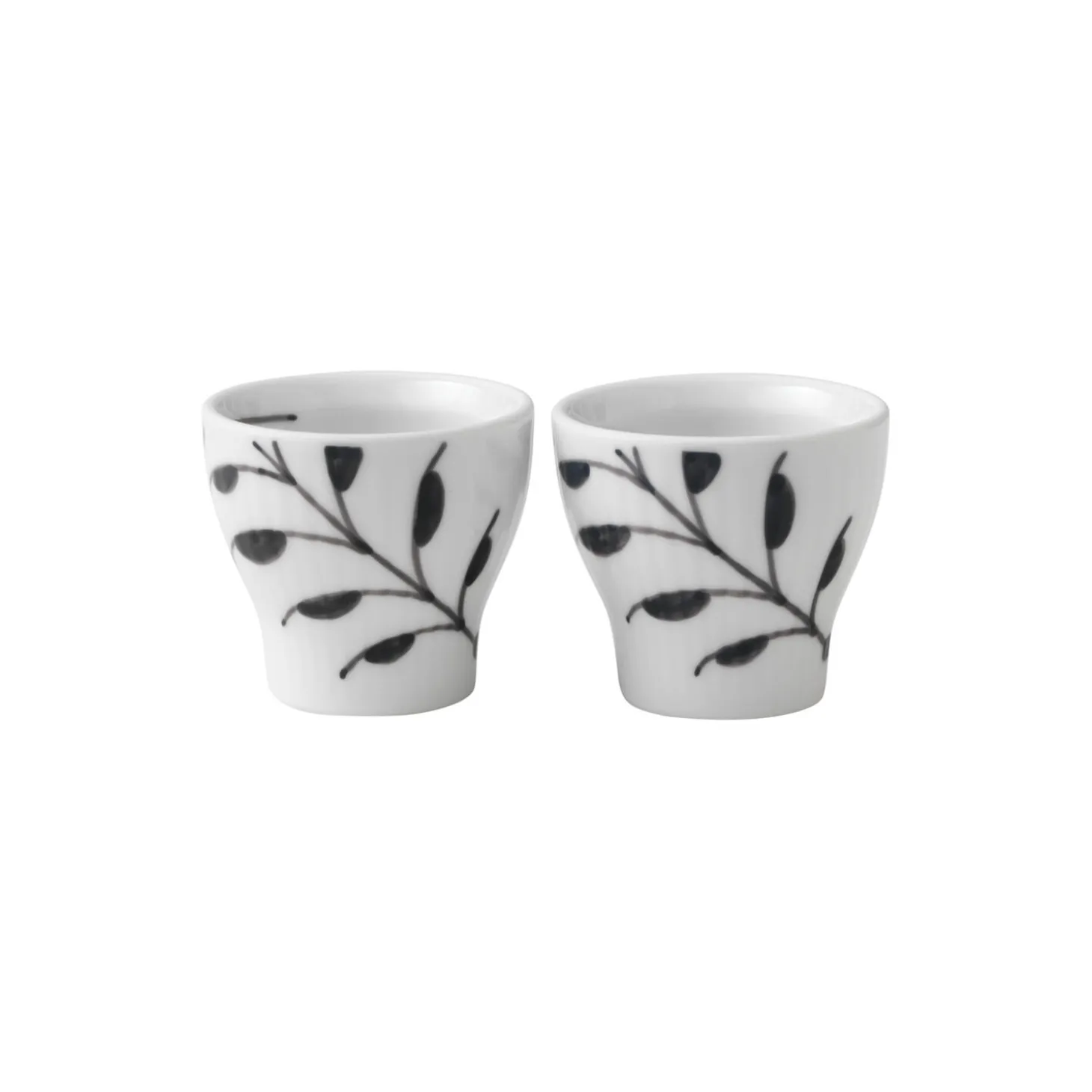 Sort Mega Riflet æggebæger i porcelæn fra Royal Copenhagen. Disse smukke æggebægre på 4,8 cm i Sort Mega Riflet prydes begge af en enkelt, håndmalet palmette. Det monokrome udtryk passer til ethvert morgenbord, hvad enten de små porcelænsdele bruges til æg eller salt og peber.