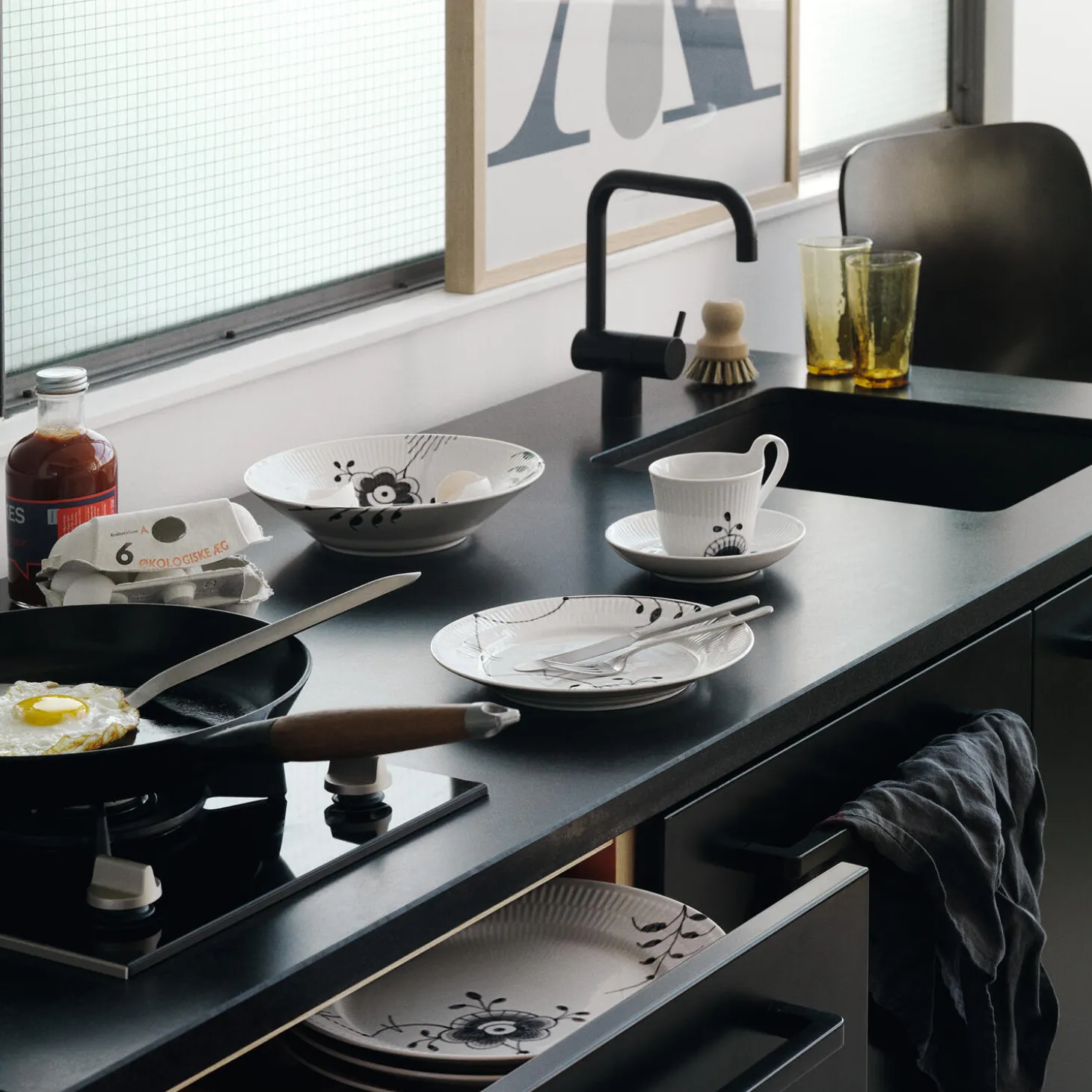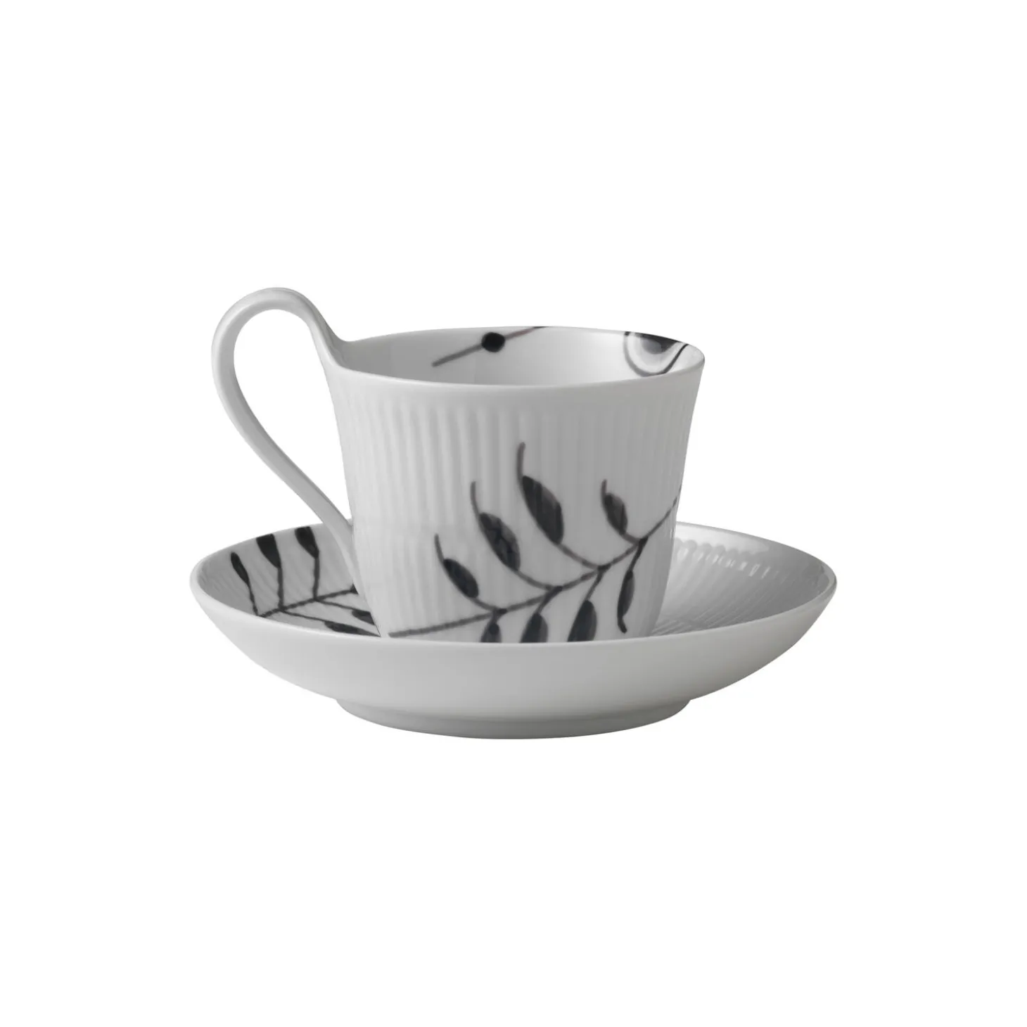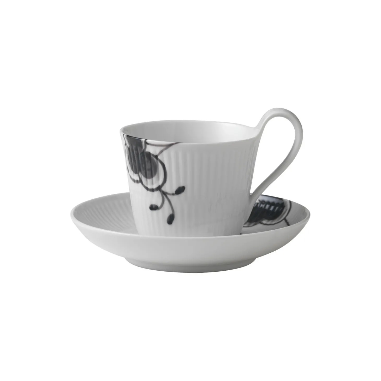 Sort Mega Riflet højhankskop med underkop i porcelæn fra Royal Copenhagen. Den elegante hank og den let buede underkop tilfører en lethed til designet af denne Sort Mega Riflet Højhankskop og underkop på 24 cl. Det håndmalede mønster i sorte og grå nuancer står i slående kontrast til porcelænskoppens hvide overflade. Den fine kop er en yndet favorit som både kaffekop og tekop.