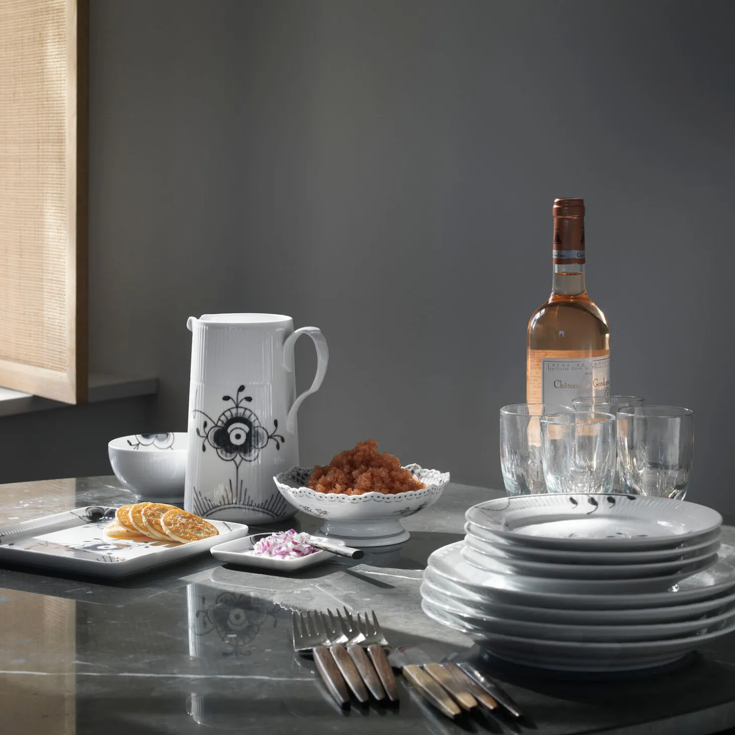 Det Sort Mega Riflet mønster skaber et moderne look til den tidløse form på denne tallerken. Tallerkenen er en re-lanvering og appellerer til dem, der elsker et monokromt udseende i sort og hvid samt er klassisk Royal Copenhagen design og håndværk. Med sine kun 19 cm er denne tallerken perfekt til frokost- eller dessertanretninger.