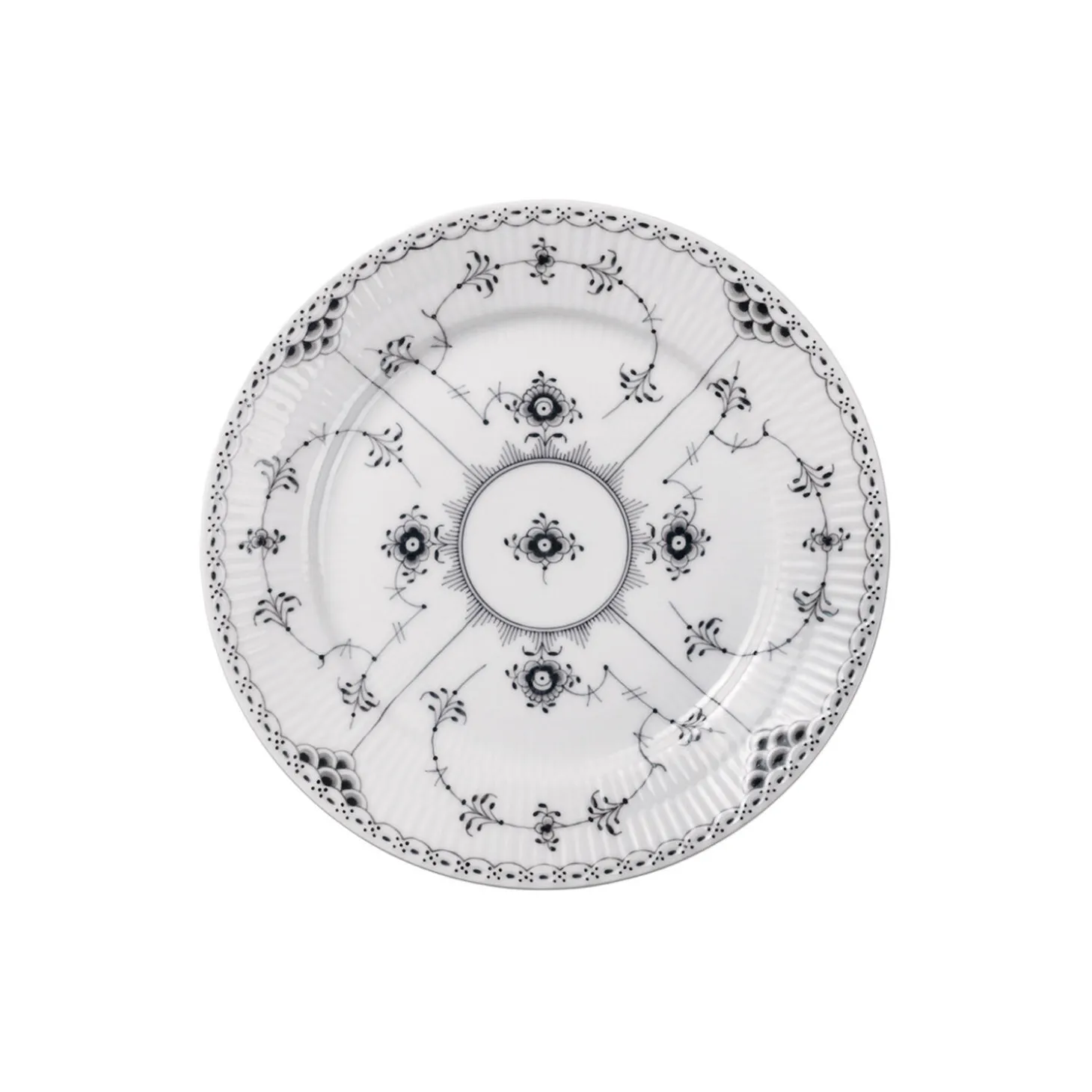 Perfekt som frokosttallerken er den 22 cm Sort Musselmalet Halvblonde tallerken en elegant tilføjelse til det sorte Royal Copenhagen univers. Porcelænets blondekant er dekoreret i den markante sorte nuance, og musselmønsteret folder sig ud fra midten.